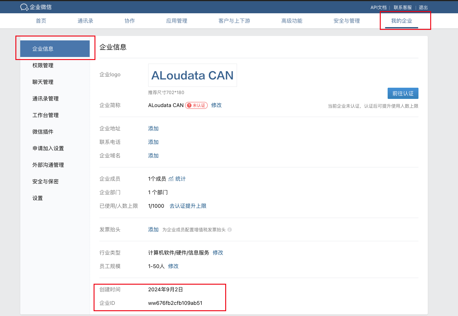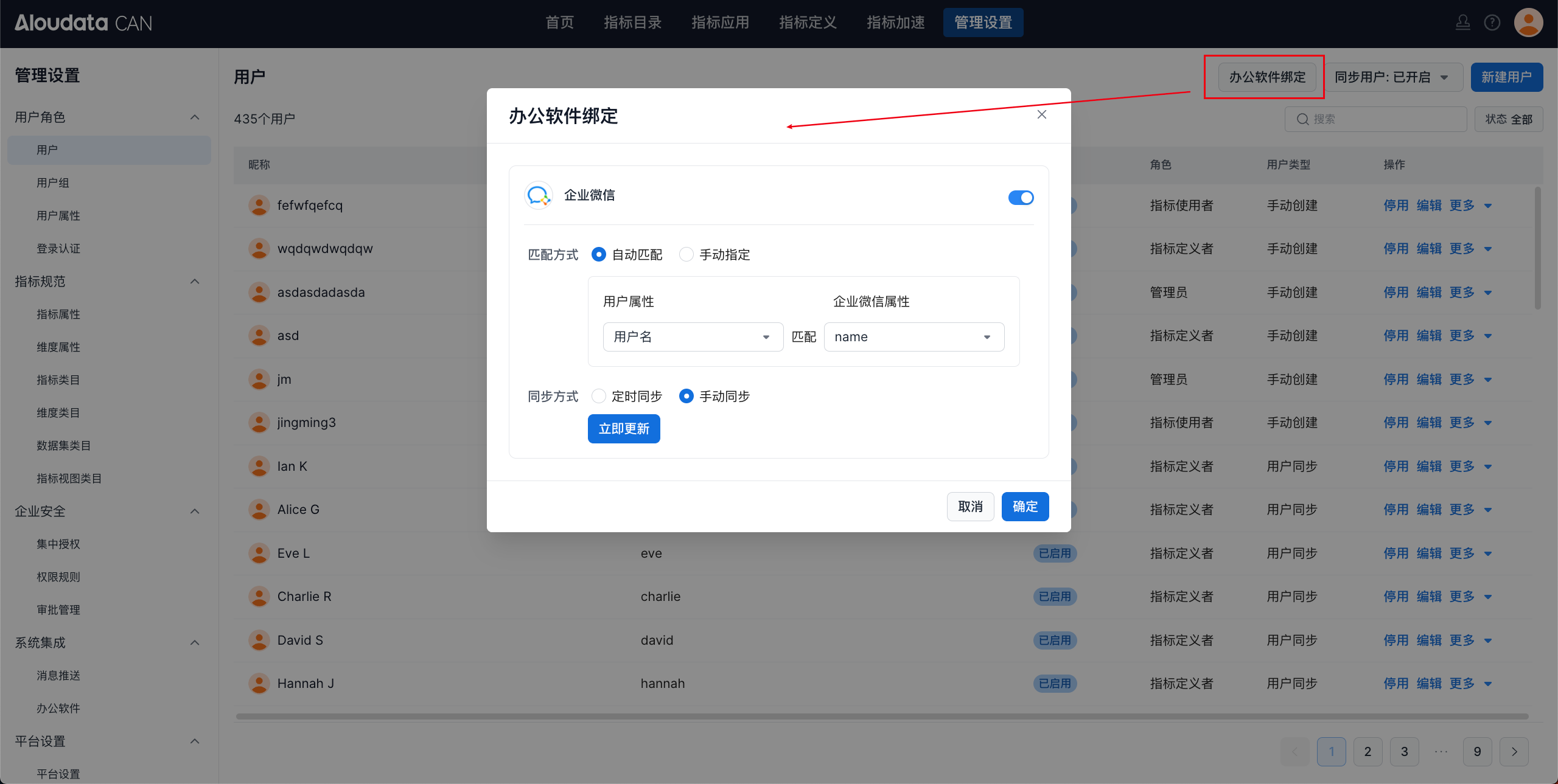 在用户管理中,进行用户的企业微信账号与 ALoudata CAN 账号的绑定。