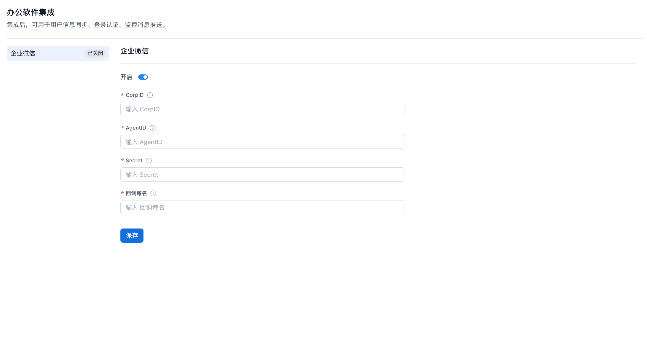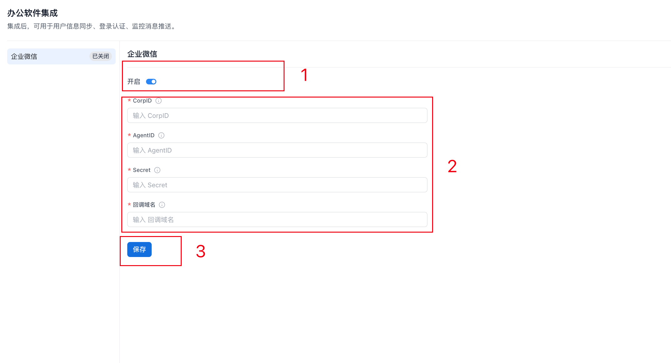 在办公软件集成处集成企业微信,需要填写