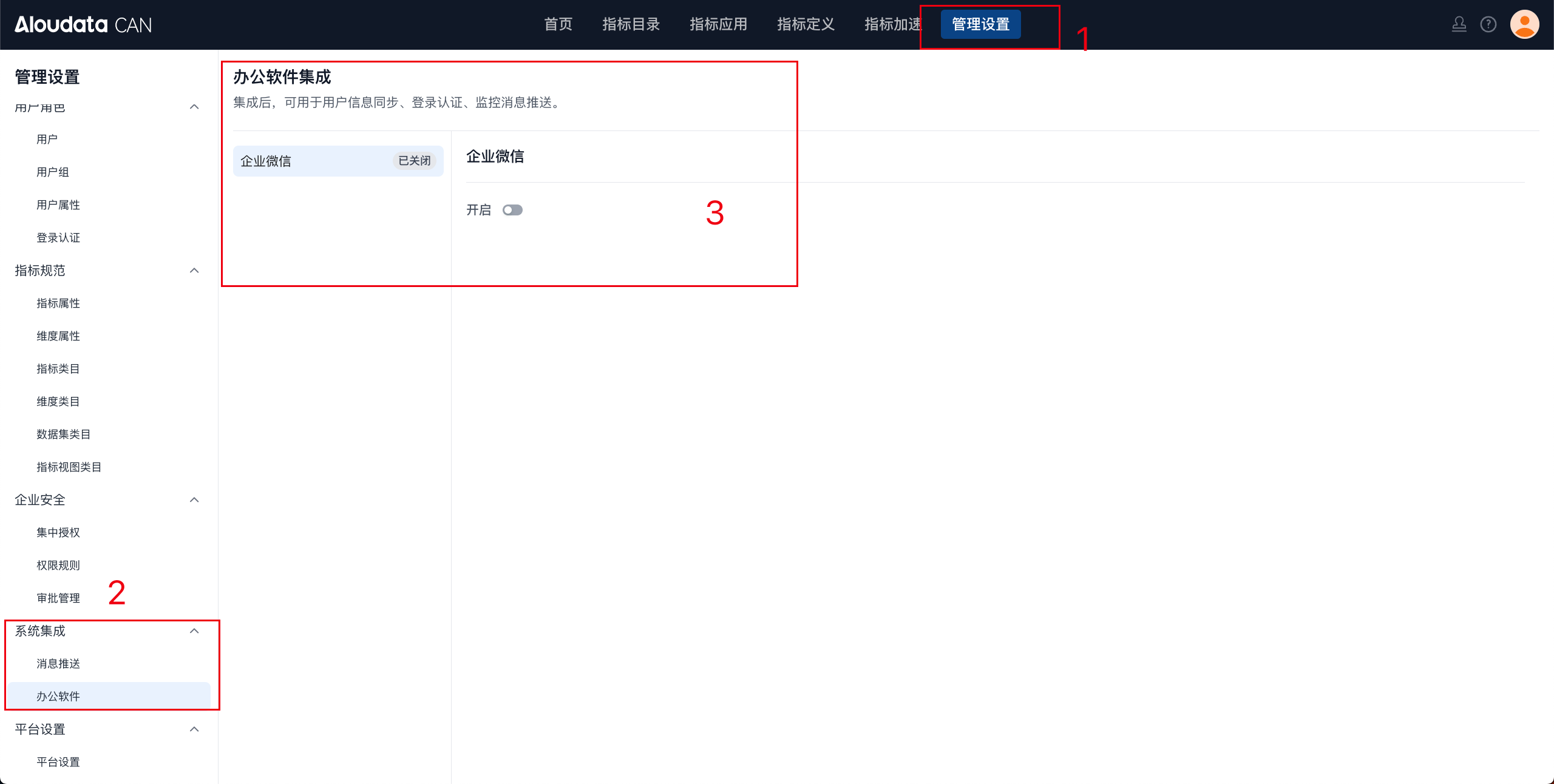 在 ALoudata CAN 页面顶部导航栏中选择管理设置,在左侧菜单中选择系统集成下的办公软件。在办公软件集成列表中选择企业微信并点击开启按钮。如下图