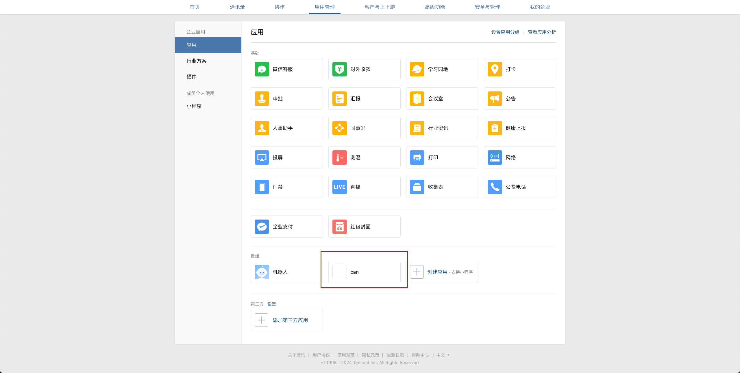 在企业微信后台管理中,应用管理->应用中创建自建应用。如下图:
