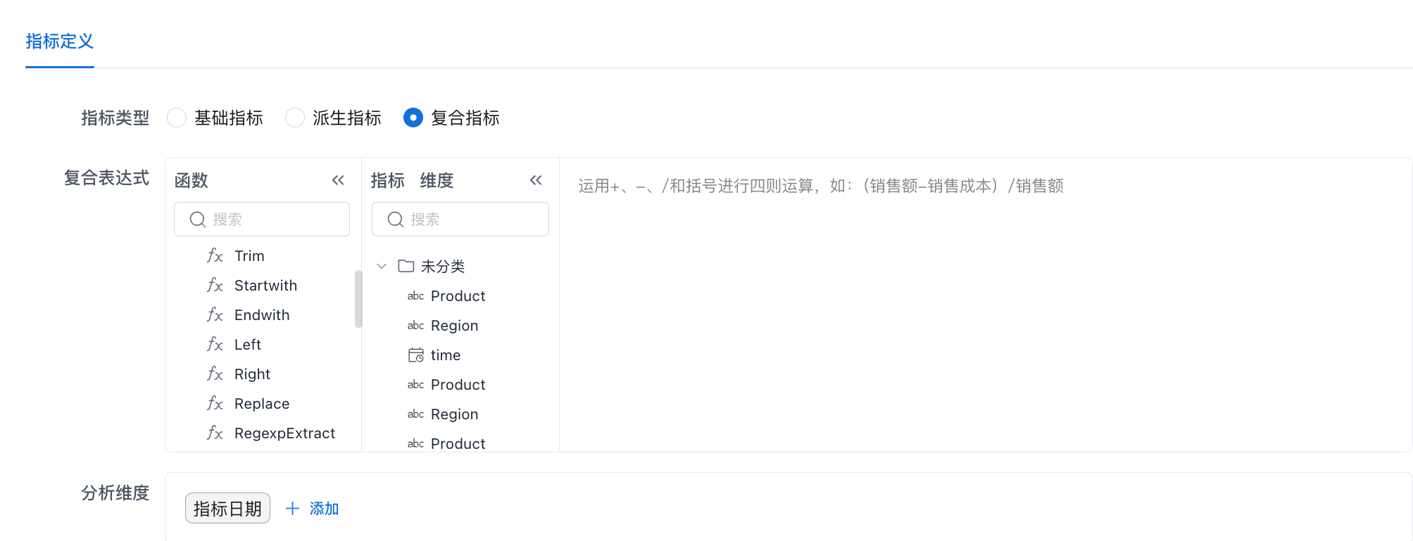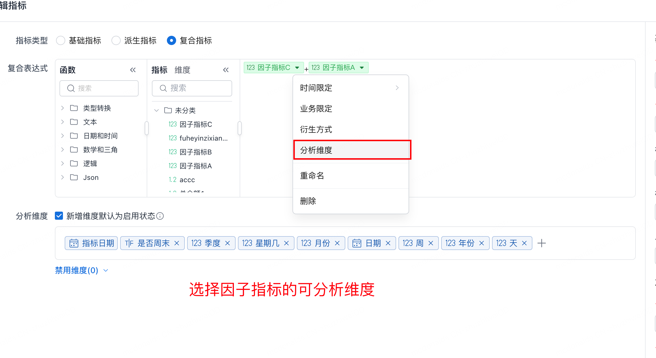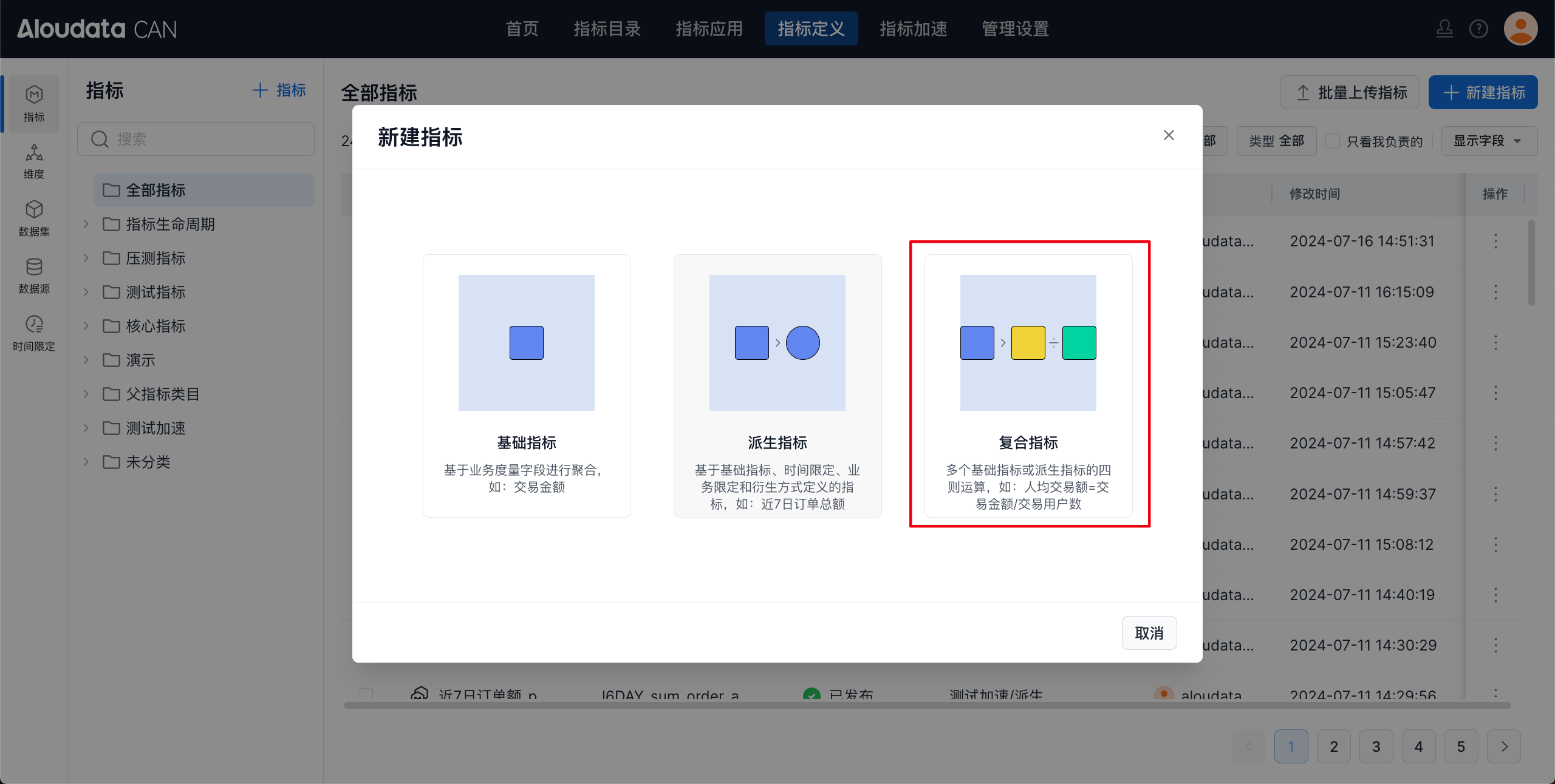 在左侧导航栏选择指标定义,在界面的右上角点击新建指标,在弹窗中选择复合指标。