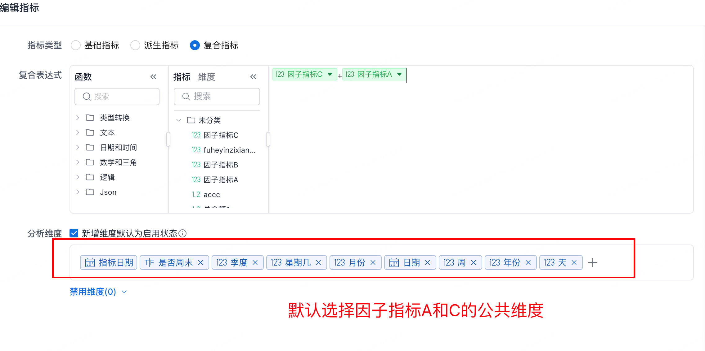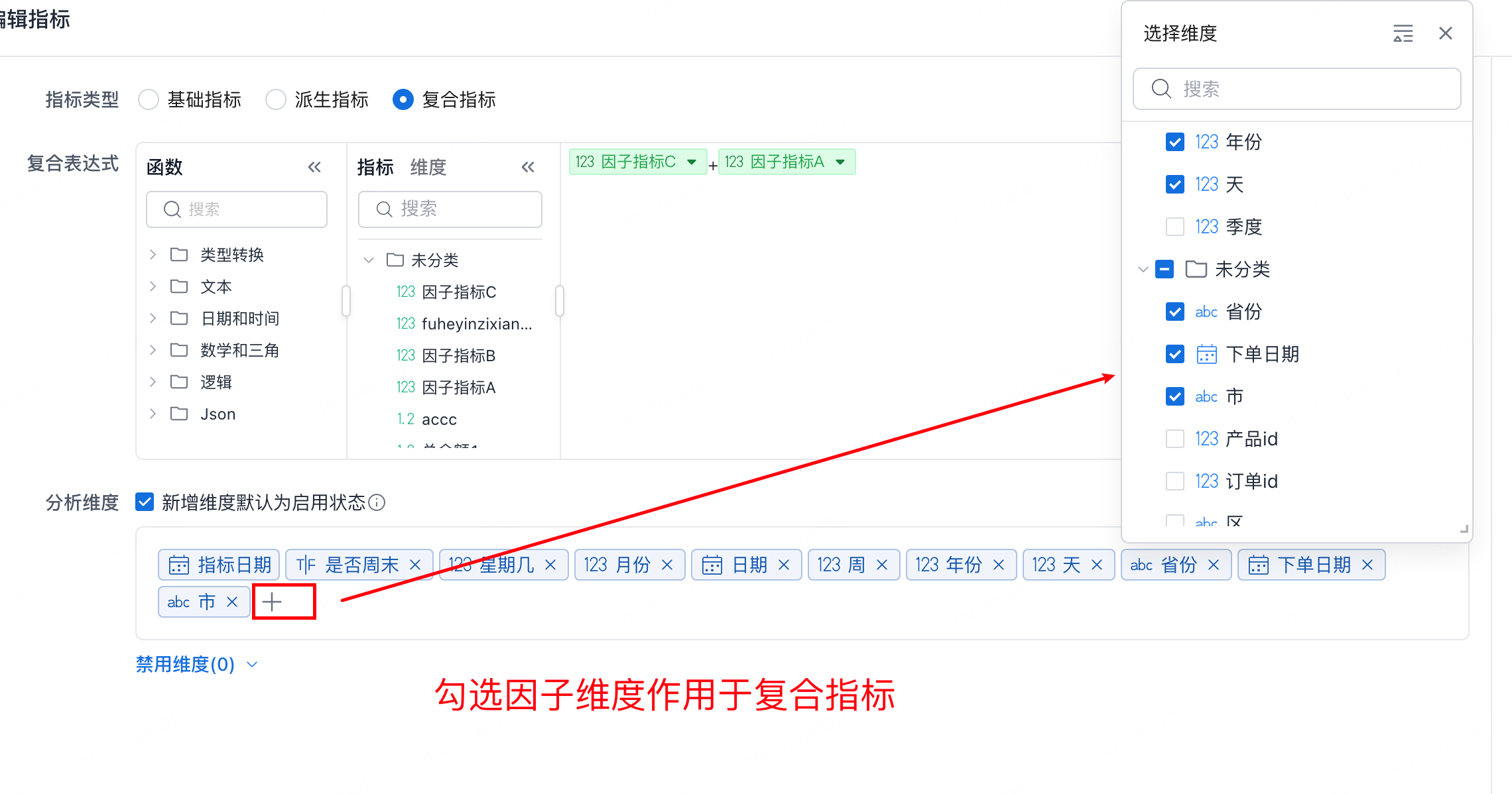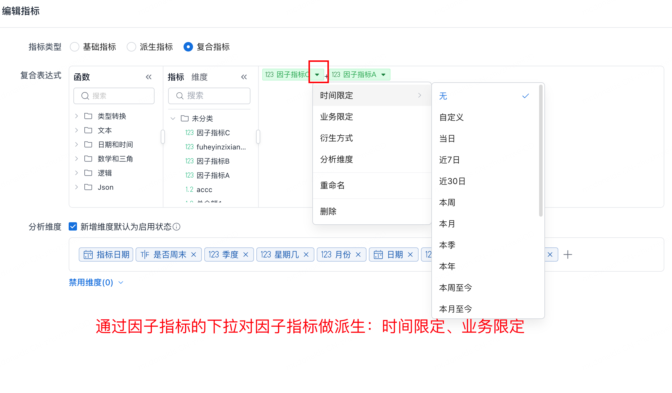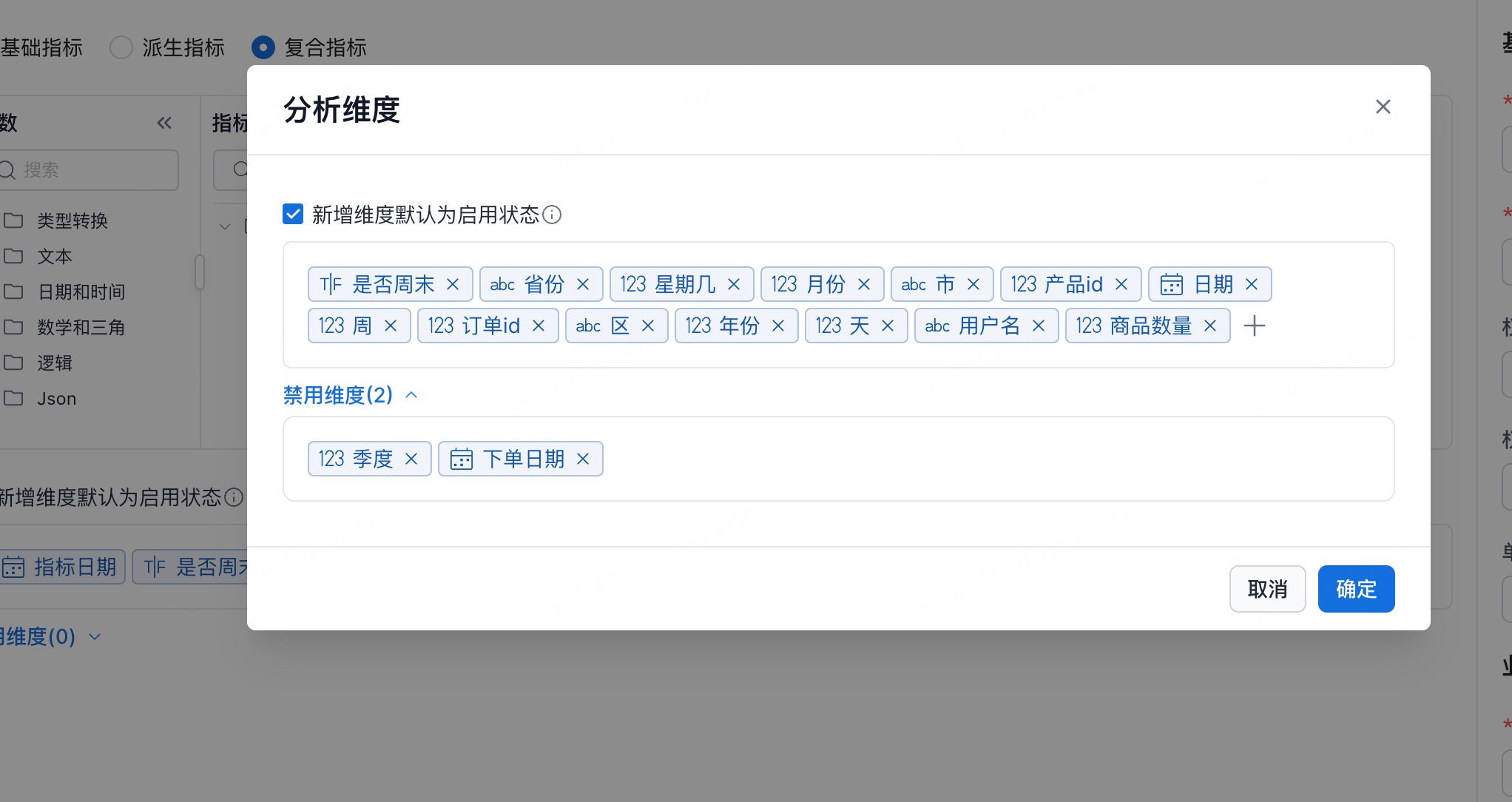 在左侧导航栏选择指标定义,在界面的右上角点击新建指标,在弹窗中选择复合指标。