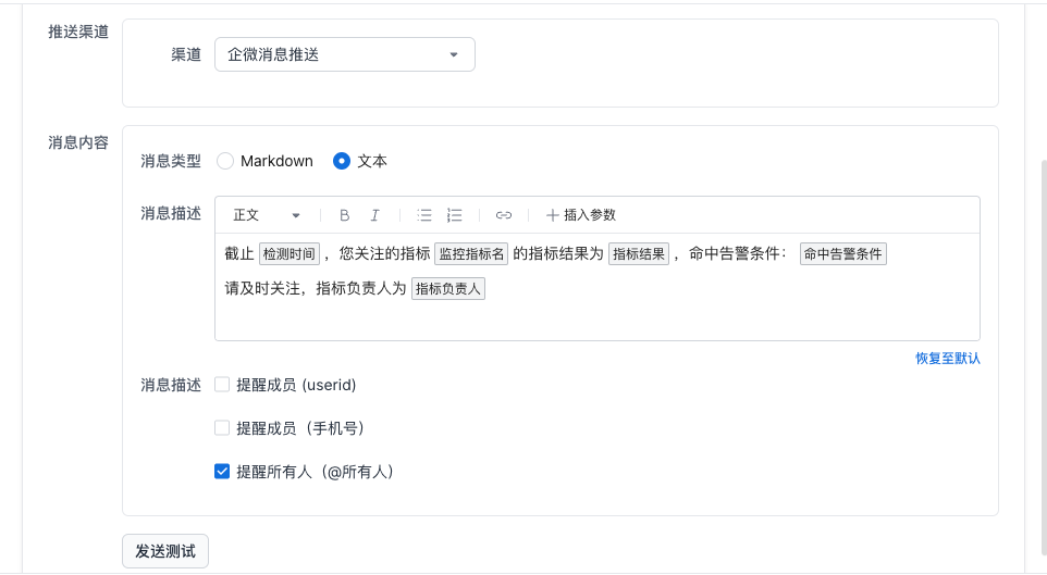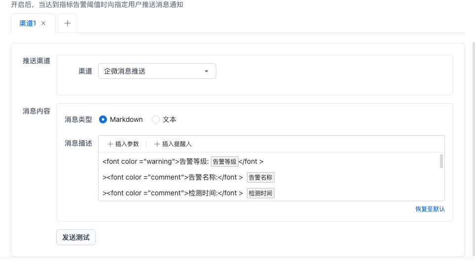 | 推送测试 | 为添加的渠道发送一条测试消息。 |