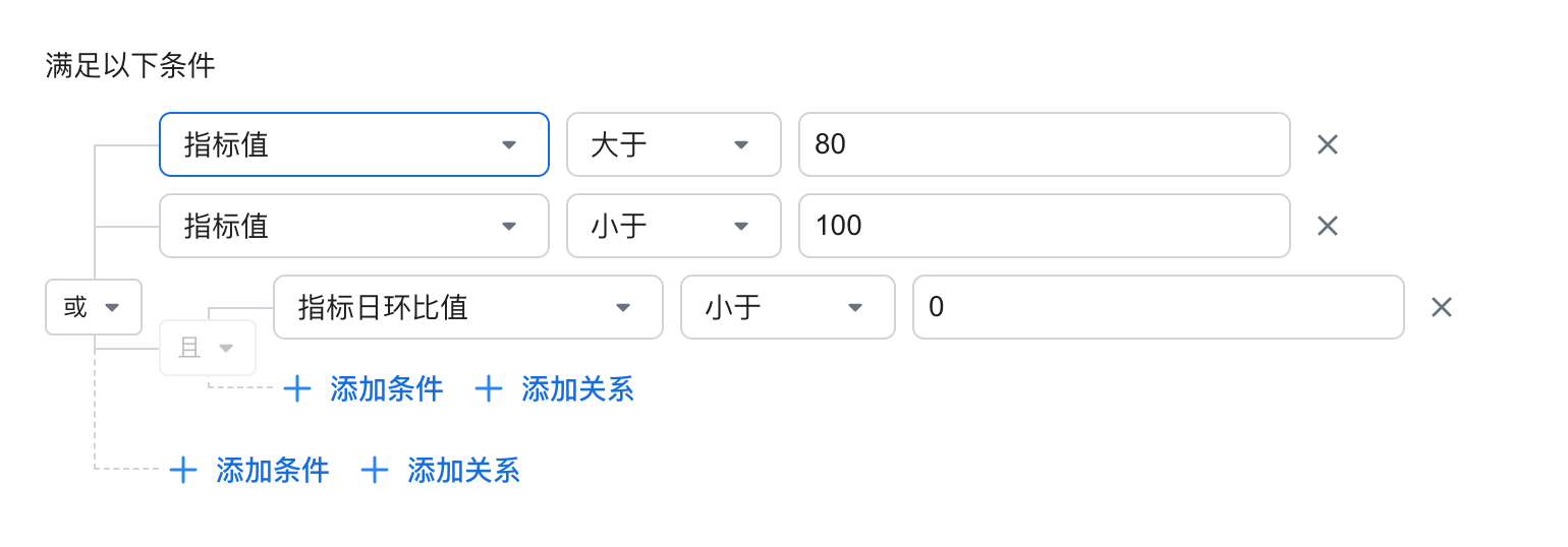 | 告警规则 | - 支持多层且或关系嵌套![]() - 指标的本体支持: - 指标值、指标日环比增长值/增长率、指标周/月/季度/年同比增长值/增长率 - 匹配符: - 等于 - 不等于 - 大于 - 大于等于 - 小于 - 小于等于 - 介于之间 - 超出范围 - 当选择为率时,系统自动添加 % |