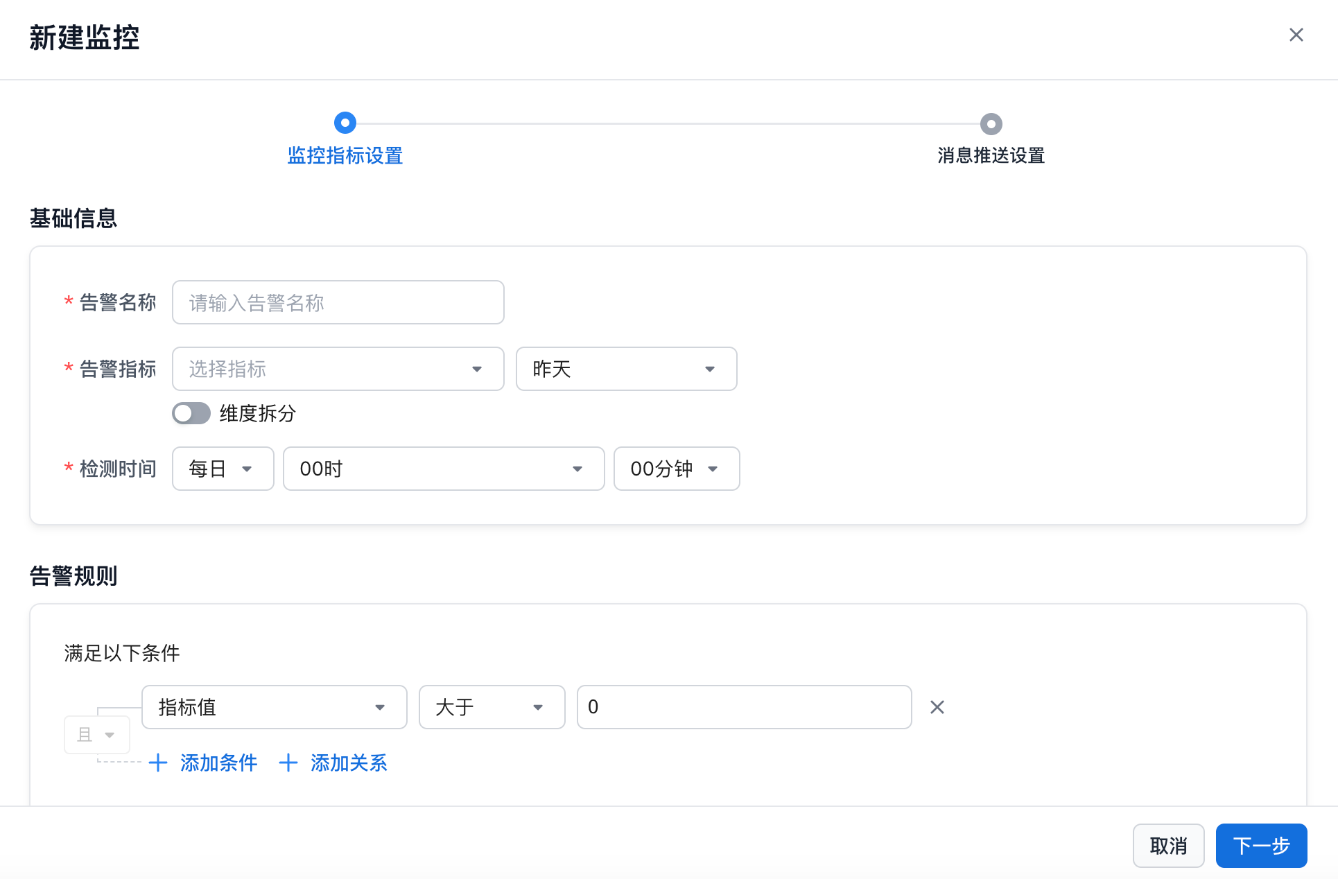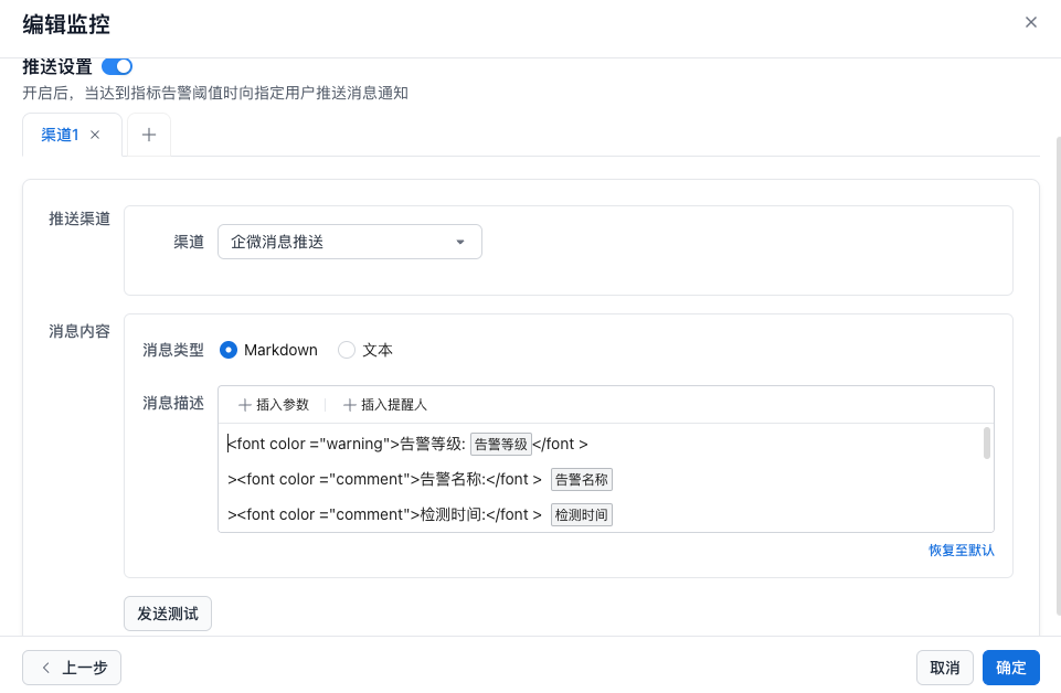 监控分为两个模块完成设置,监控指标和消息推送之间可以随意切换,不会影响已经填写的配置内容。但是在提交时会进行整体的校验。