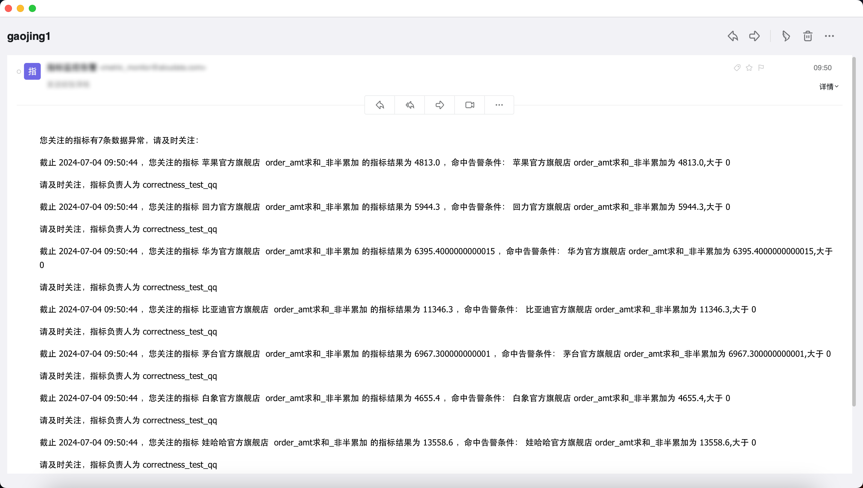 | 消息内容 | 标题:邮件的标题消息描述:以下为默认推送内容:截止 检测时间 ,您关注的指标 拆分维值 监控指标名 的指标结果为 指标结果 ,命中告警条件: 命中告警条件 请及时关注,指标负责人为 指标负责人 。示例如下![]() |
