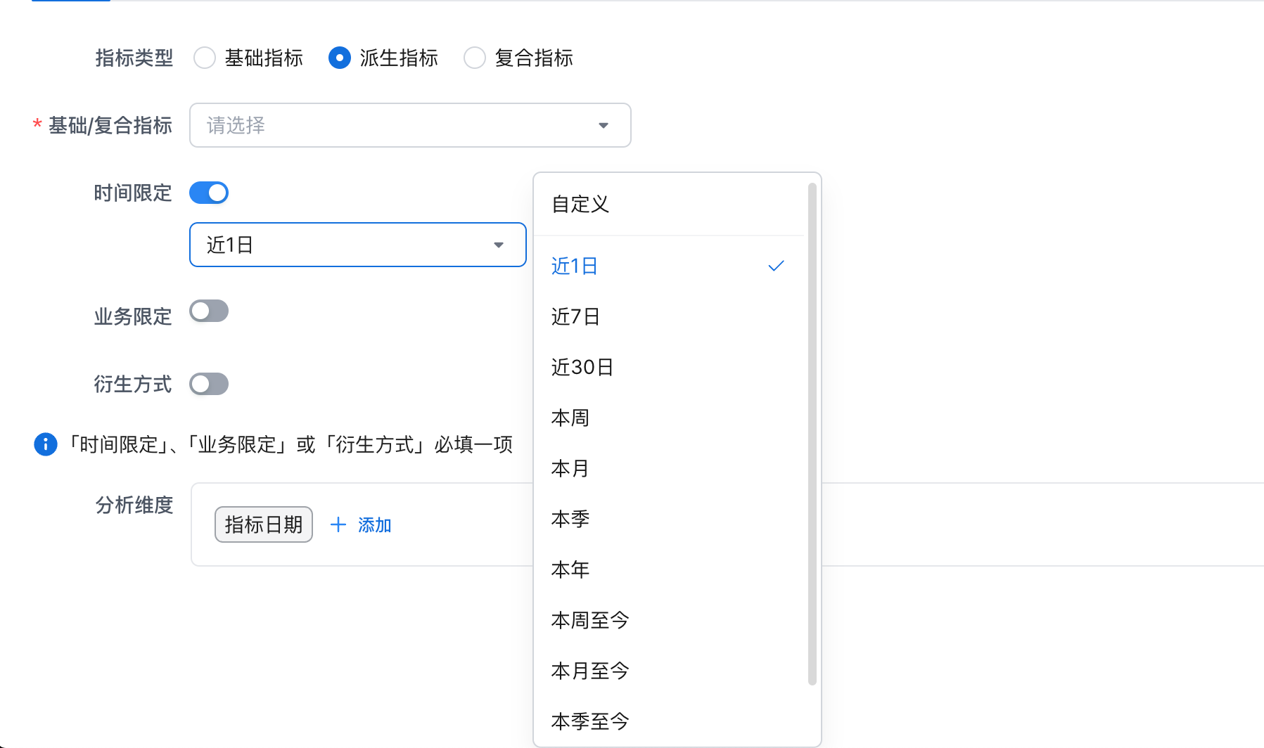 派生指标需要基于一个原子指标或不包含派生指标的复合指标进行定义。