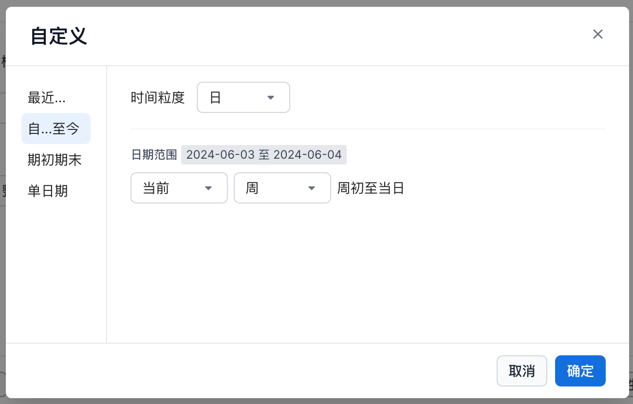 最近...通过 最近... 模式定义统计日期,适用于以当前时间为基准,向前后向后偏移一段时间的范围选择,以下为常见的配置:- 时间粒度日 - 过去3日至当日- 以 2024-05-20 为例,统计的时间范围为 2024-05-17~2024-05-20 ,共4日- 时间粒度日 - 过去1月至当日- 以 2024-05-20 为例,统计时间范围为 2024-04-20~2024-05-20- 时间粒度月 - 未来1年至当月- 以 2024-05-20 为例,统计时间范围为 2024-05月~2025-05月两个整月的数据- 时间粒度日 - 过去5日(交易日)至当日- 以 2024-05-20 为例,统计时间范围为 以2024-05-20作为基准,向前找5个交易日 |