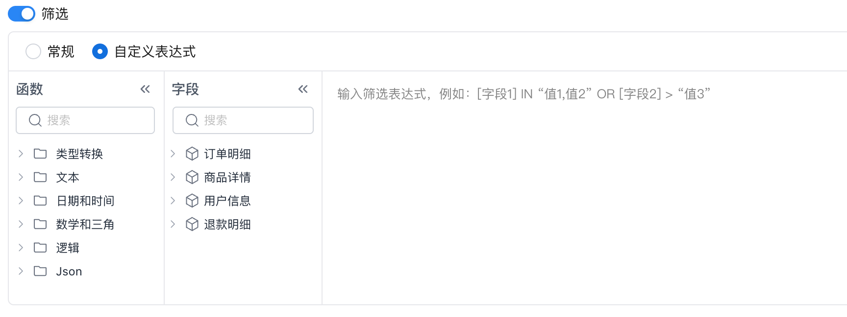 - 自定义表达式:使用筛选表达式,进行字段的筛选,指标会基于筛选后的数据内容计算