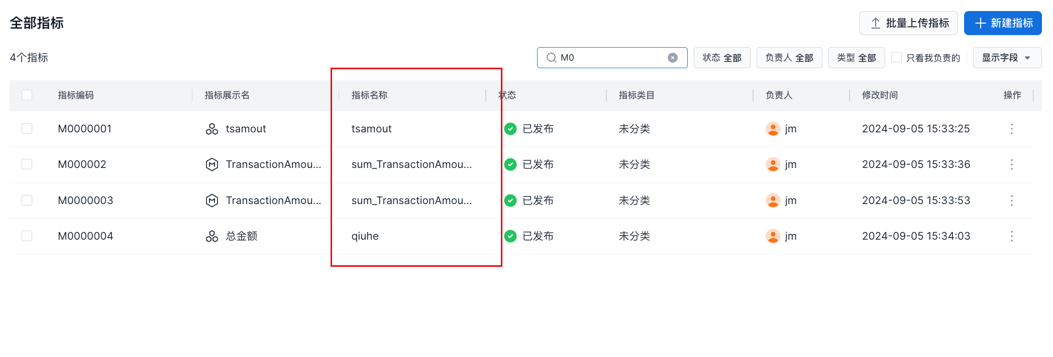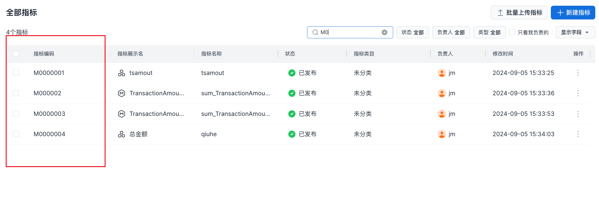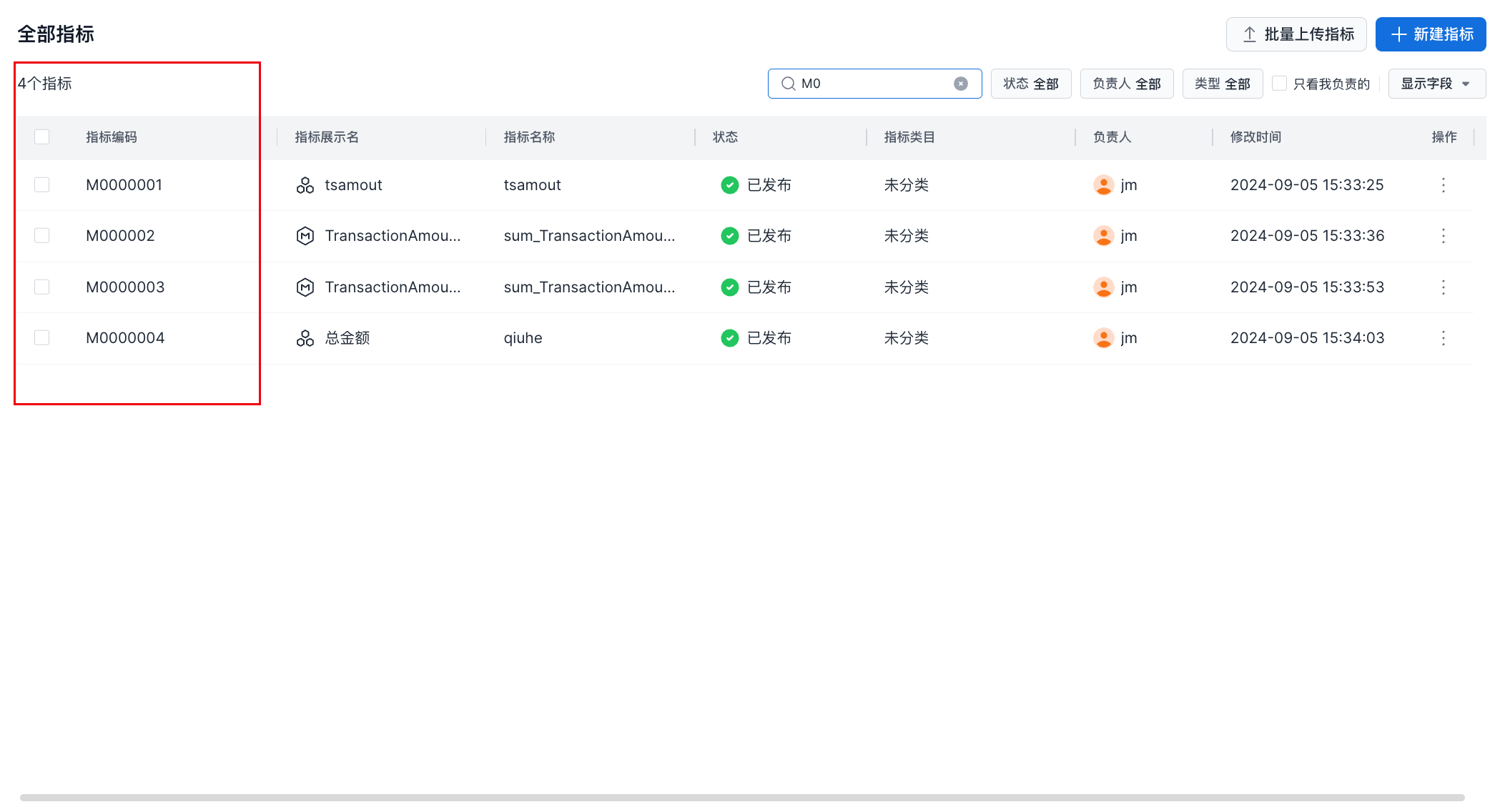 在启用指标/维度编码后,指标列表界面增加一个指标编码字段,并且支持通过指标编码进行指标搜索。如下图