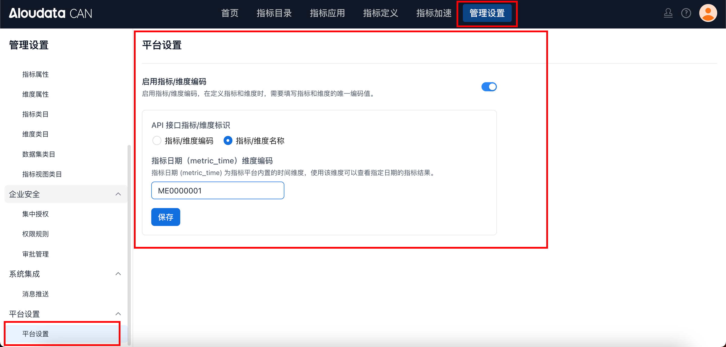 在 Aloudata CAN 平台中可以通过在平台设置中启动指标/维度编码。