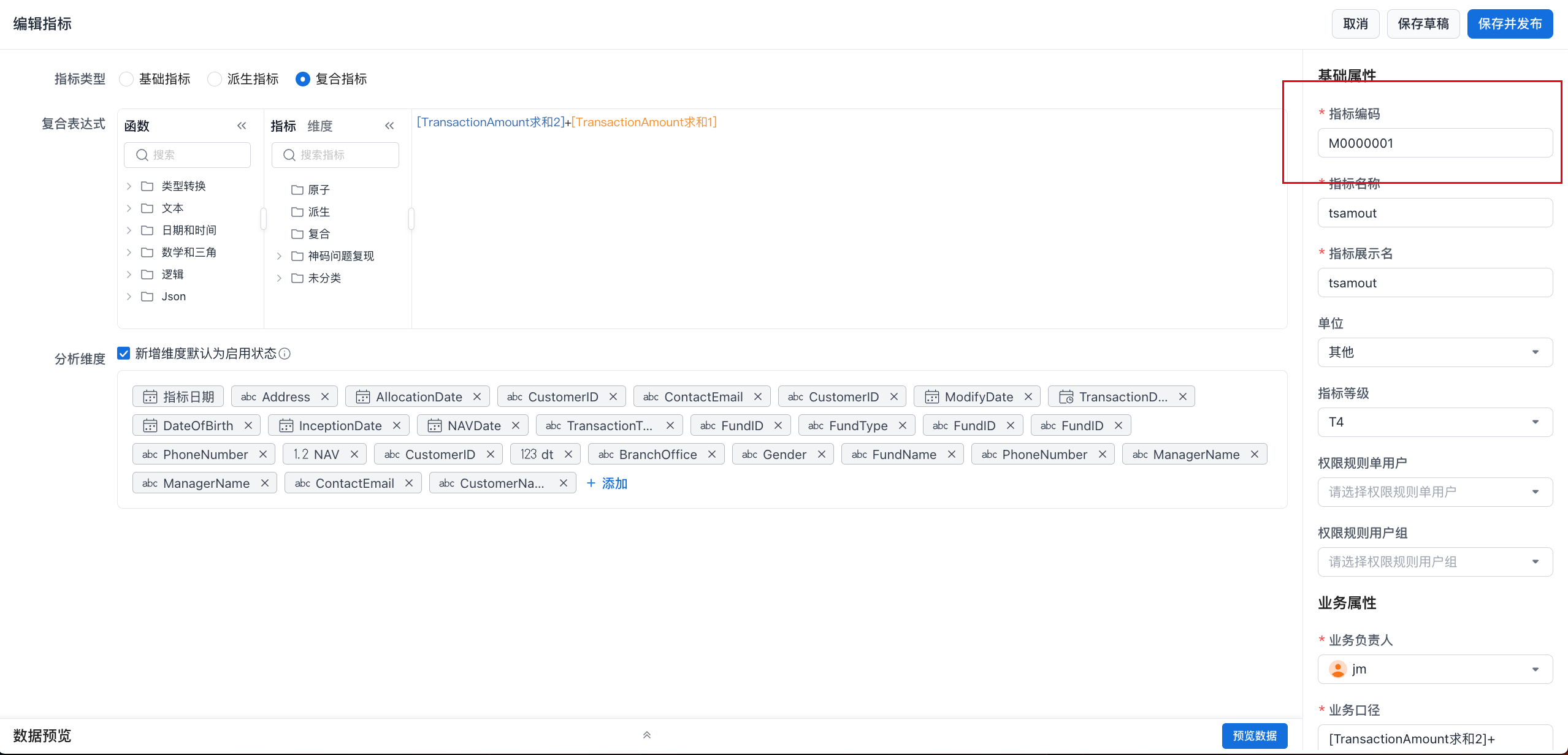 在选用指标/维度编码后,指标调用需要指定指标编码,如下图