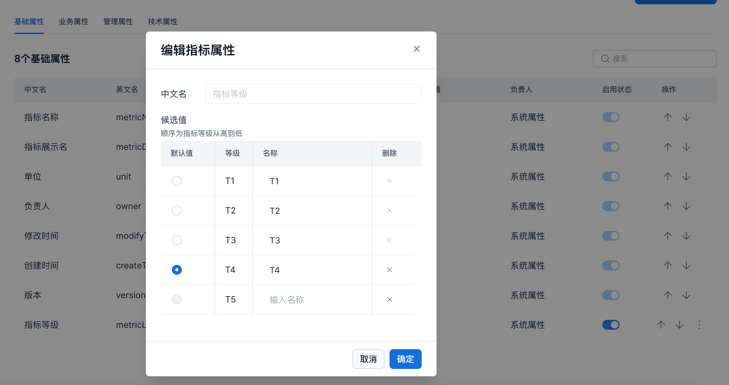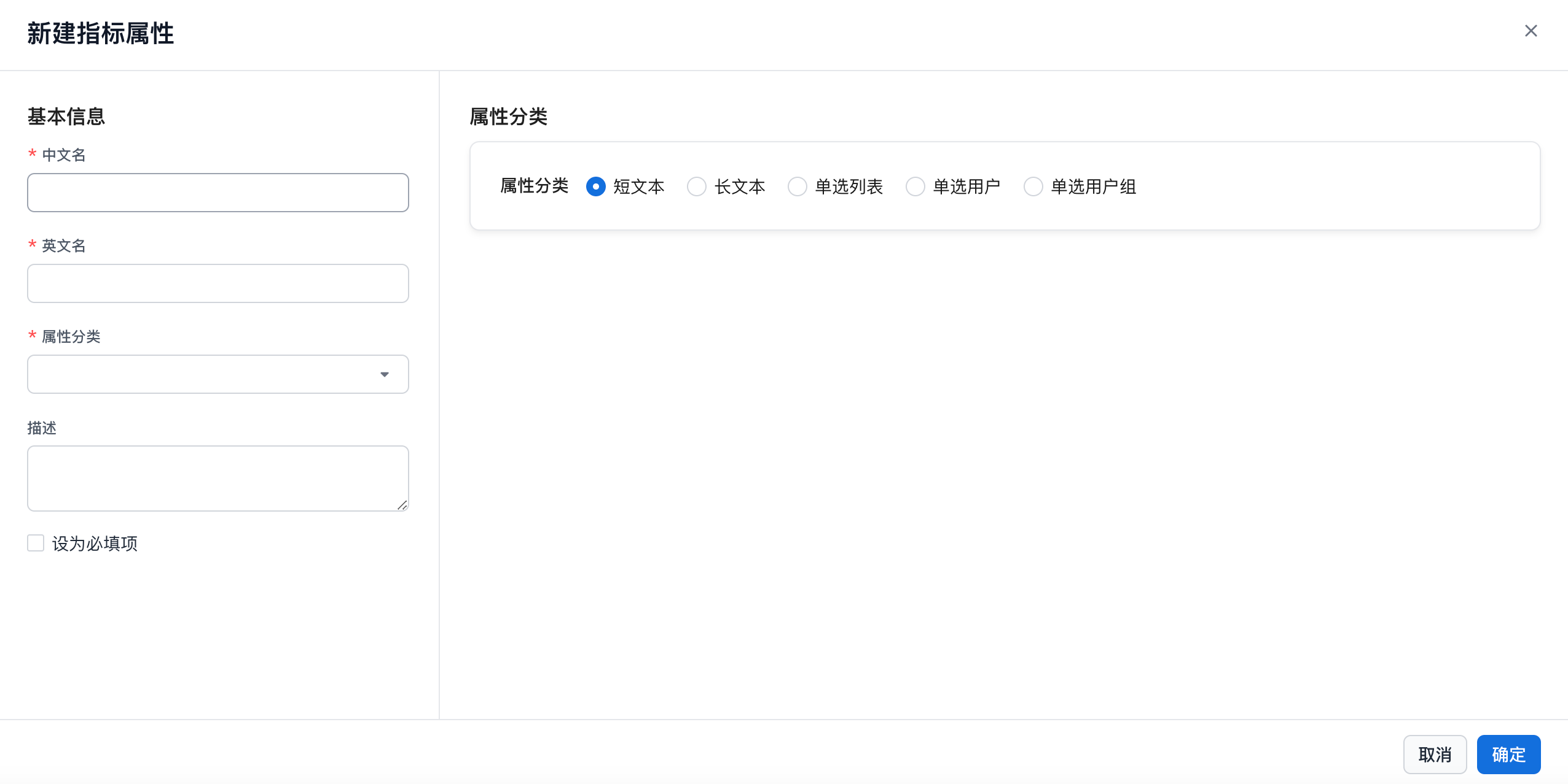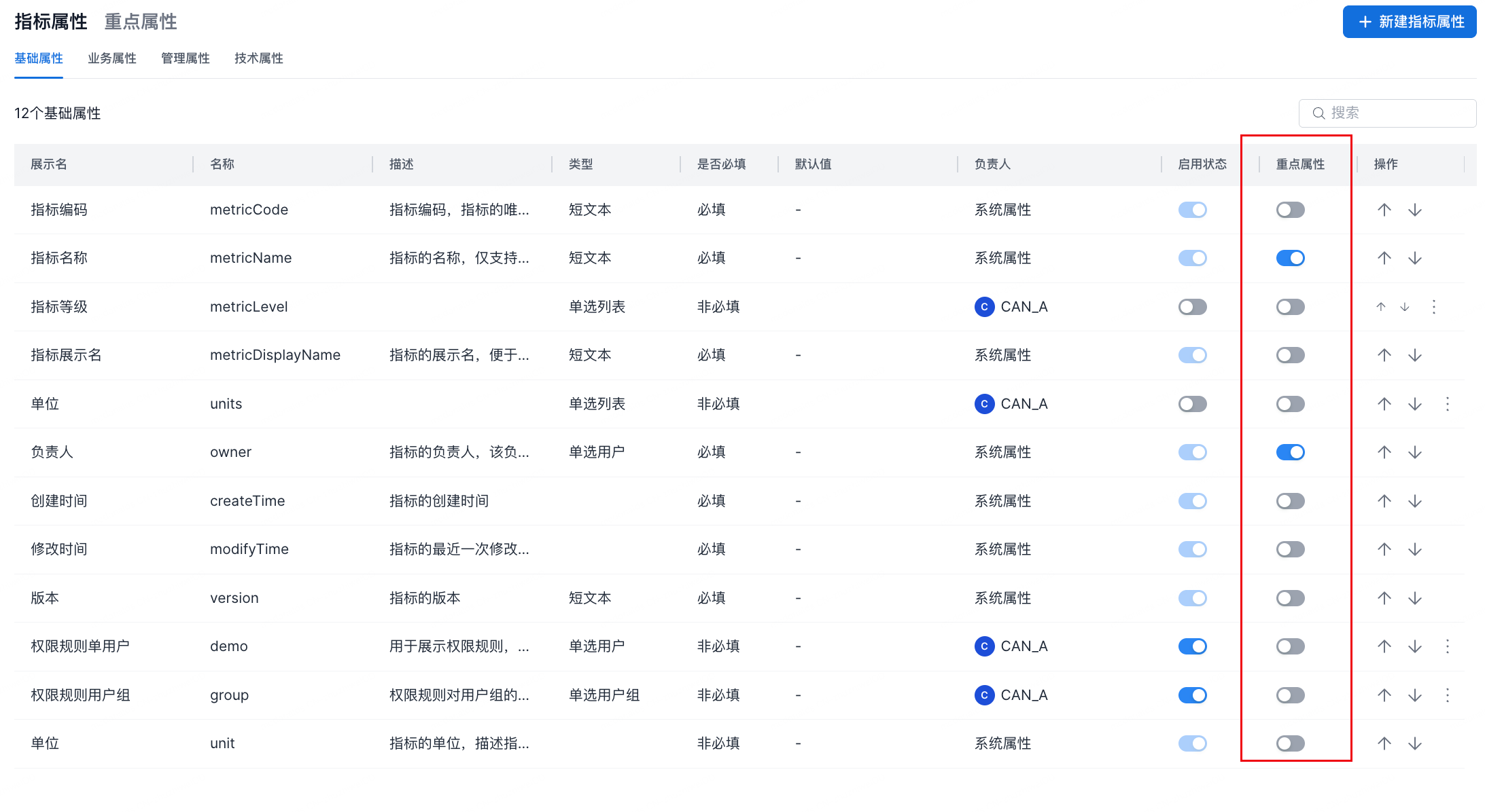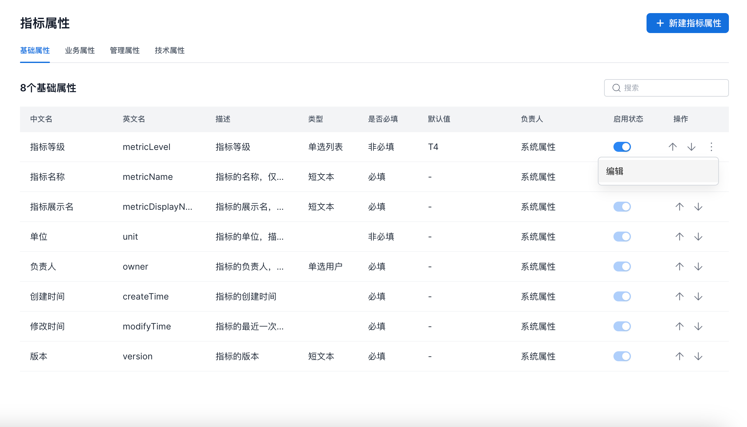 | 属性分类 | 基础属性、业务属性、技术属性、管理属性;从新建指标属性入口进入,带入当前界面的属性分类 |