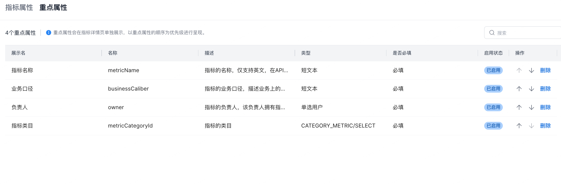重点属性启用后,该属性会优先展示于指标详情概览页。在重点属性页签中可对重点属性进行顺序调整。