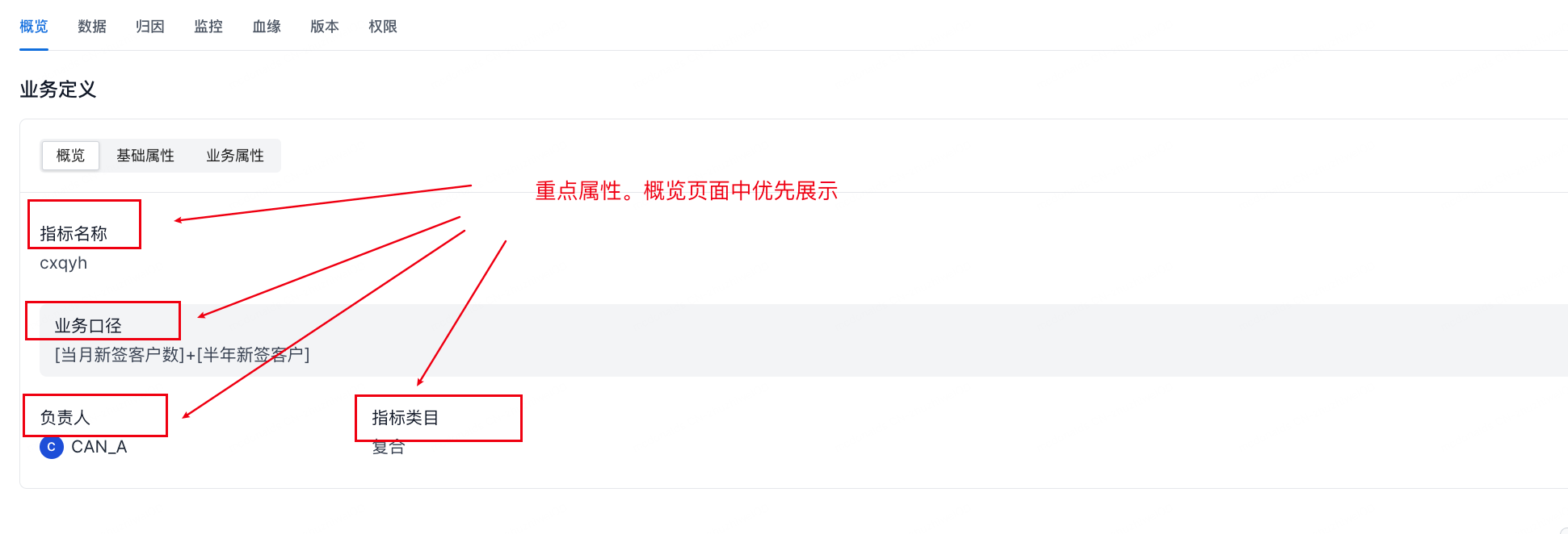 | 业务口径 | businessCaliber | 指标的业务口径,描述业务上的指标统计规则 | 长文本 | 必填 | 无 | 系统属性 |