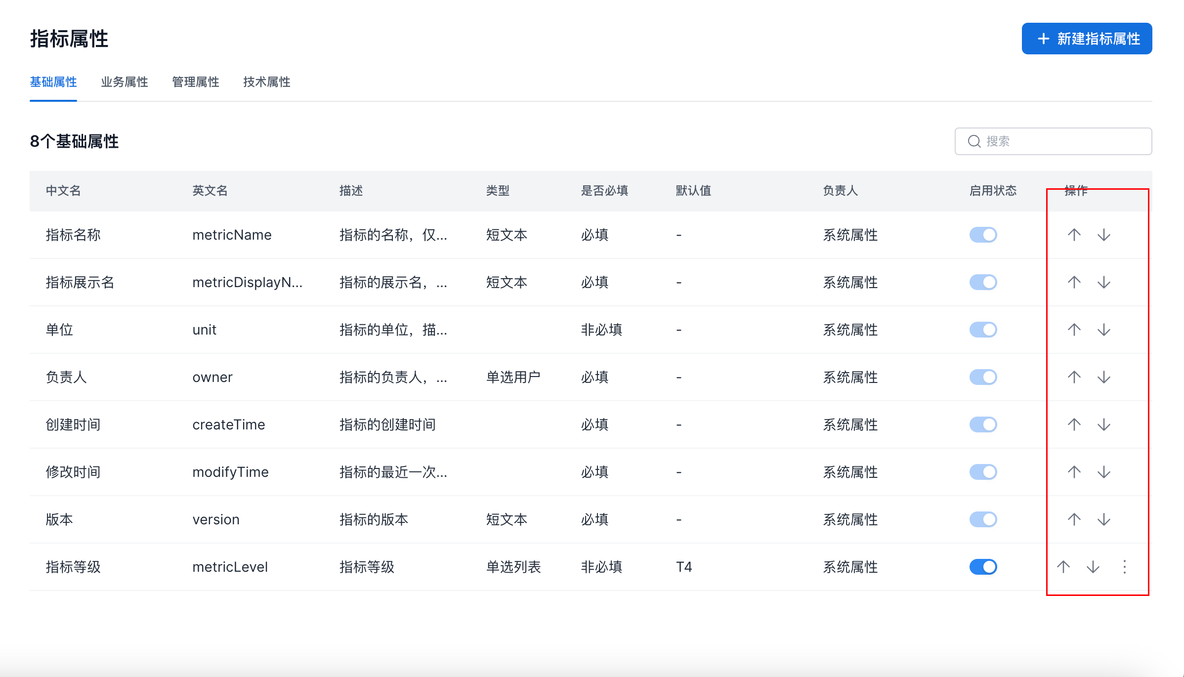 基础属性、业务属性、技术属性、管理属性四个分类,支持在单个分类中调整属性的顺序。