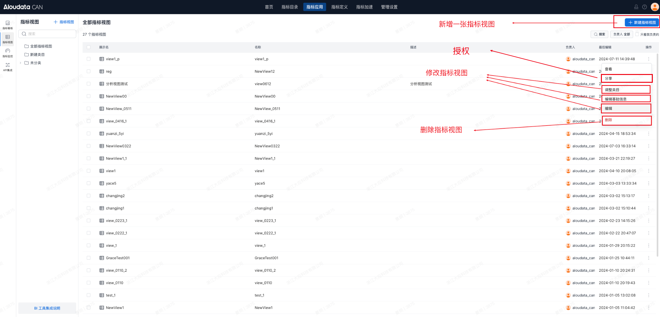 概述 本章节介绍如何创建和管理指标视图。 创建指标视图 指标视图中支持对指标进行维度分析、指标快速衍生同环比、排名和占比等,详情请参考:创建指标视图 管理指标视图 对指标视图进行增删改,以及授权。更多详情请参考:管理指标视图