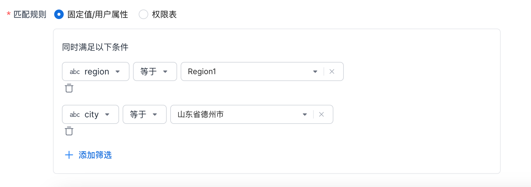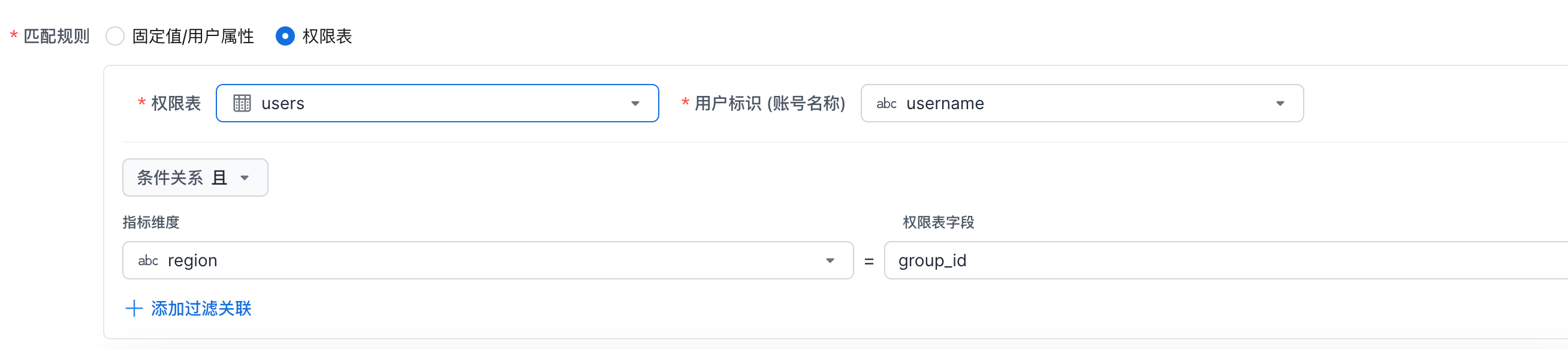 配置匹配规则:选择指标维度和权限表字段。查询时,会转换为 维度 = "表.字段值" 的筛选条件。