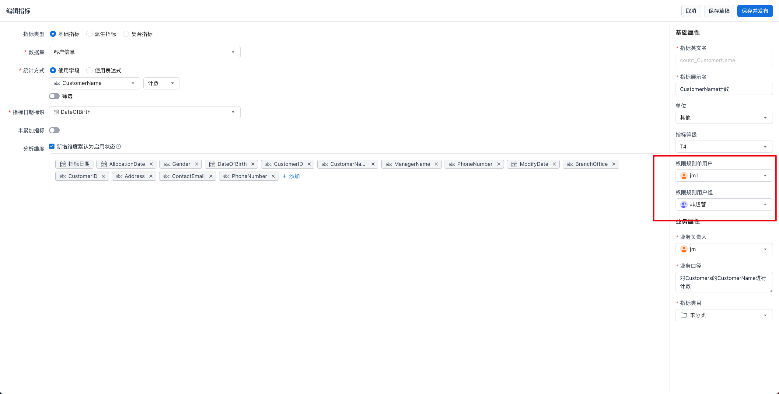 创建指标,指定基础属性中“权限规则单用户”与“权限规则用户组”。如下图