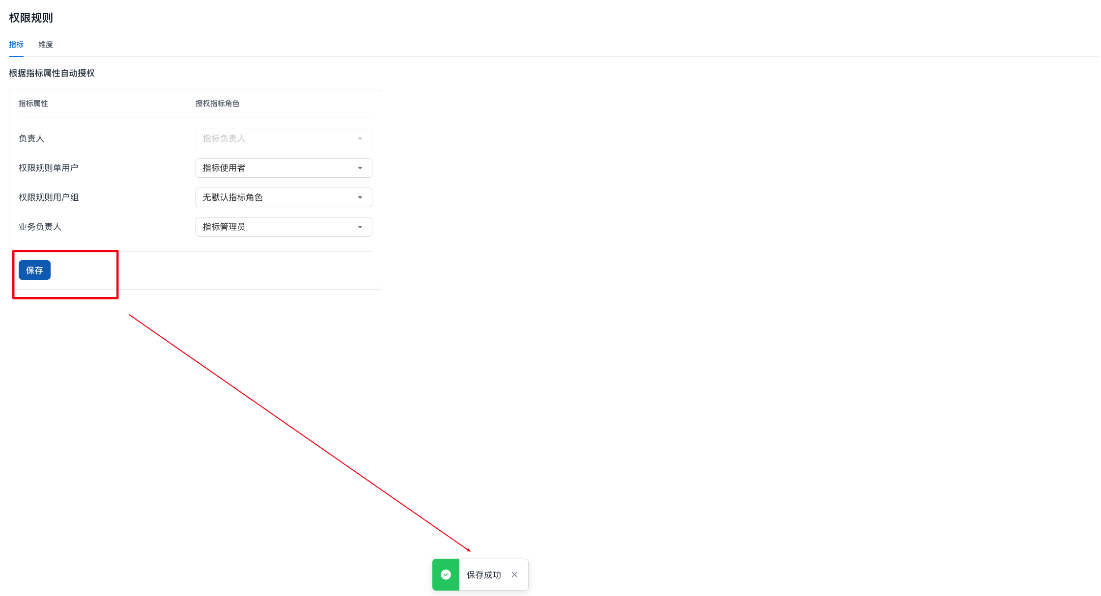 完成规则配置后,通过点击“保存”按钮确认更改。系统将即时反馈保存状态,屏幕下方出现“保存成功”的提示信息,表明权限规则已成功生效。