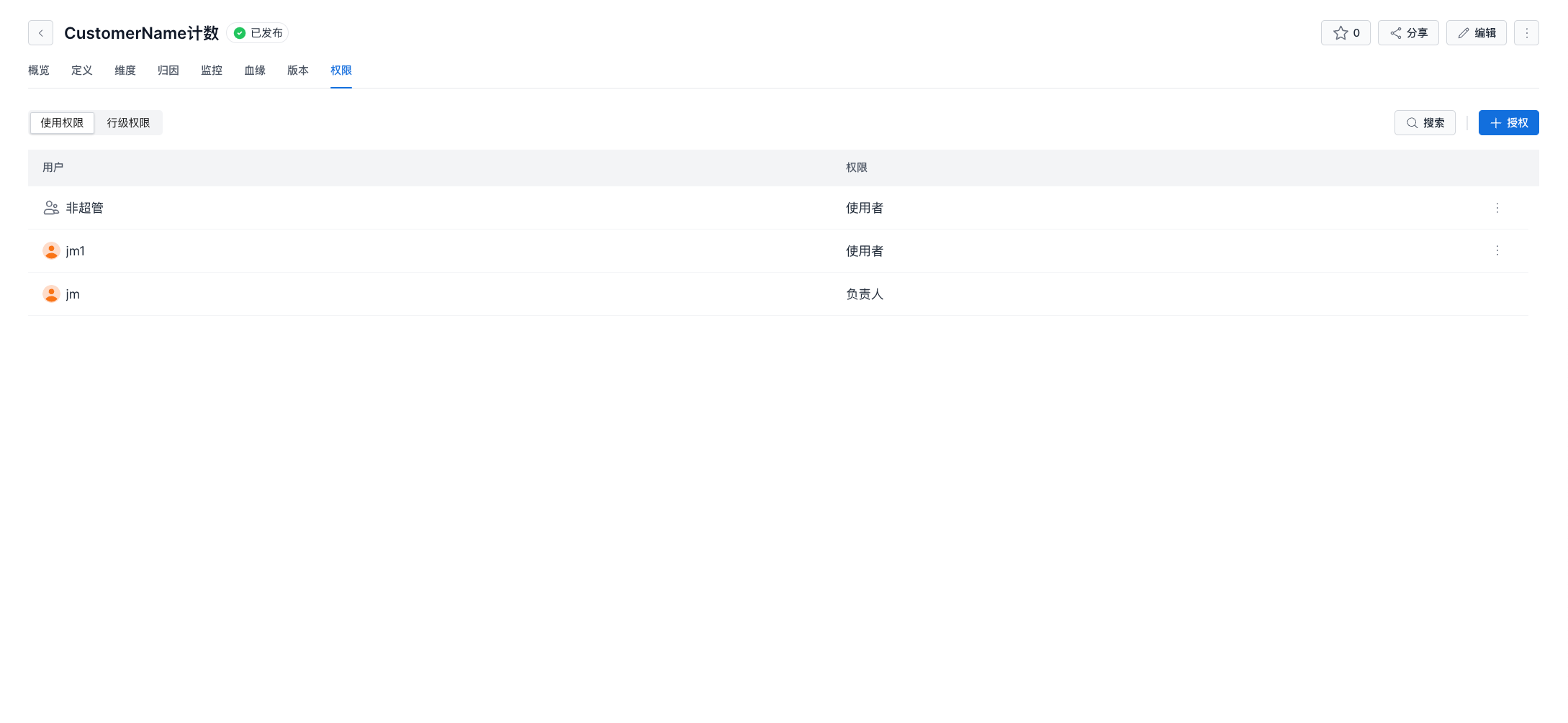 | 授权指标角色 | - 无默认管理角色:该指标不赋予任何预设权限。 - 指标管理员: - 具备指标定义的编辑权。 - 可授权或撤销其他用户/用户组的使用或管理权限(负责人享有全权限控制,非负责人权限调整范围受限)。 - 能够调整指标的分类归属。 - 指标使用者:仅享有指标的查看与使用权限,无编辑或权限分配能力。 |