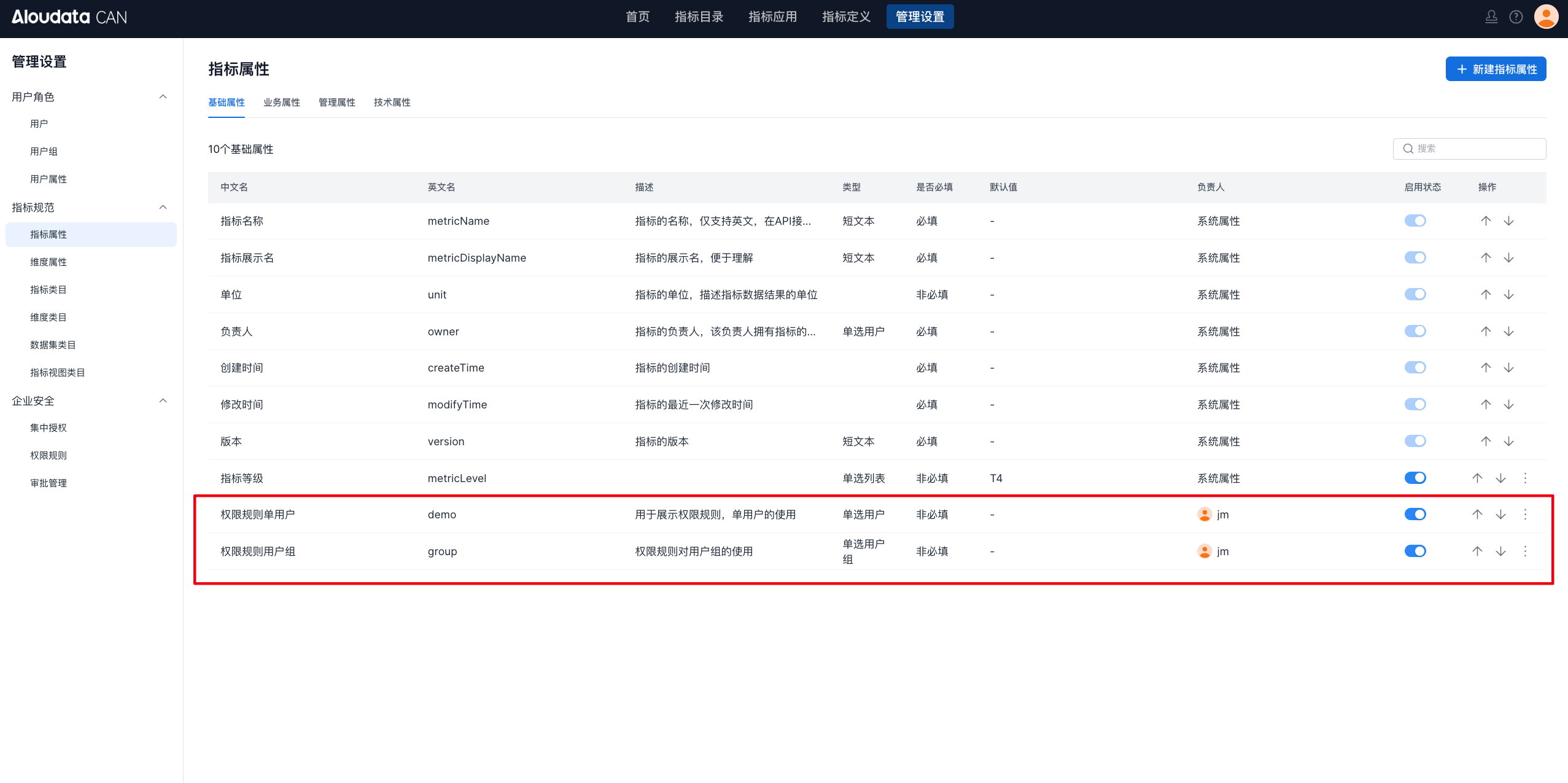 确保已在指标属性管理与维度属性管理模块中配置了自定义属性。这些自定义属性需设定为“单选用户组”或“单选用户”类型,且属性分类不受特定限制。指标属性的创建参考:指标属性管理与维度属性管理