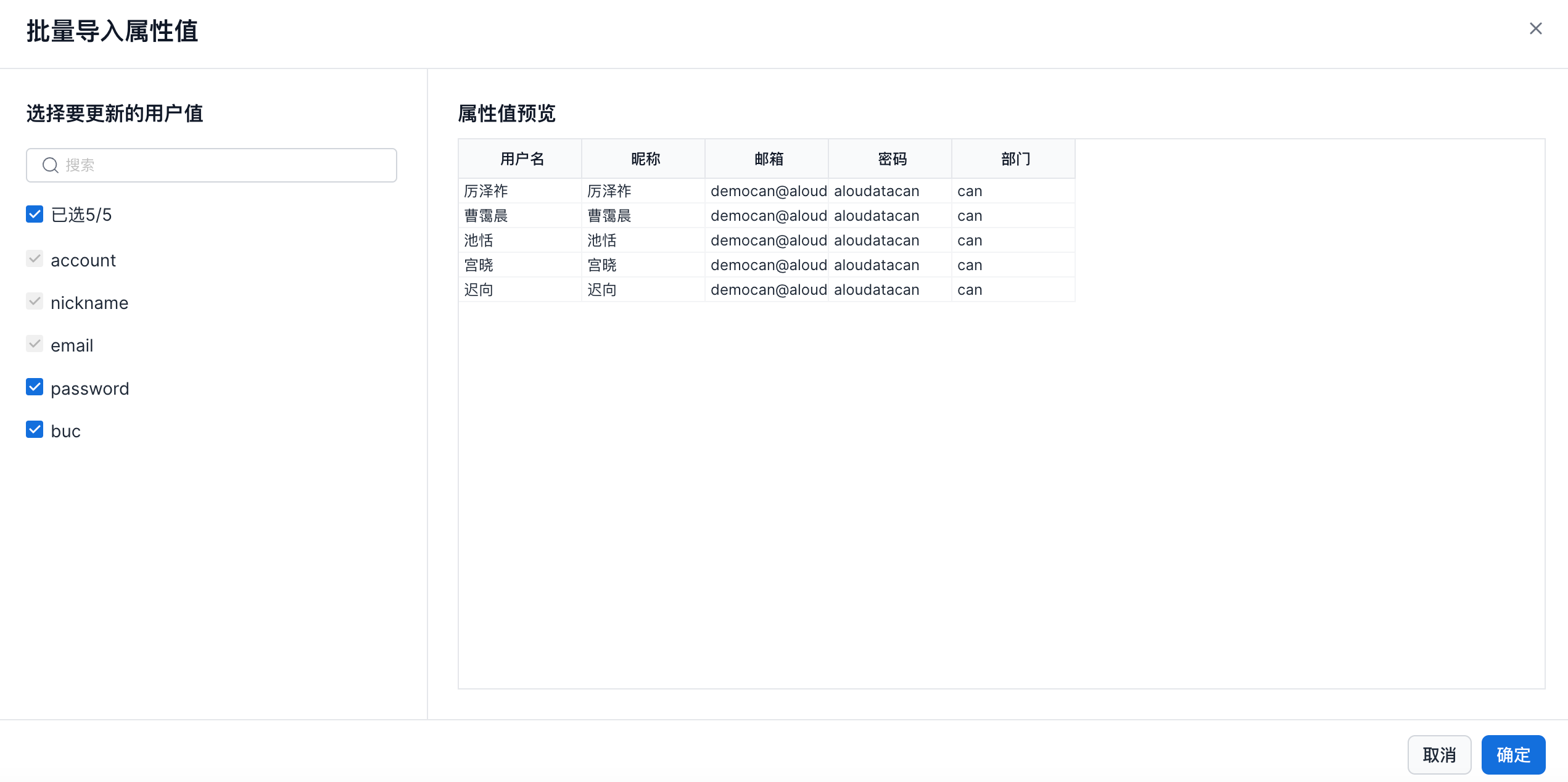 用户上传文件后,进行文件内容解析,选中需要更新的用户属性值,如下图选择 password、buc