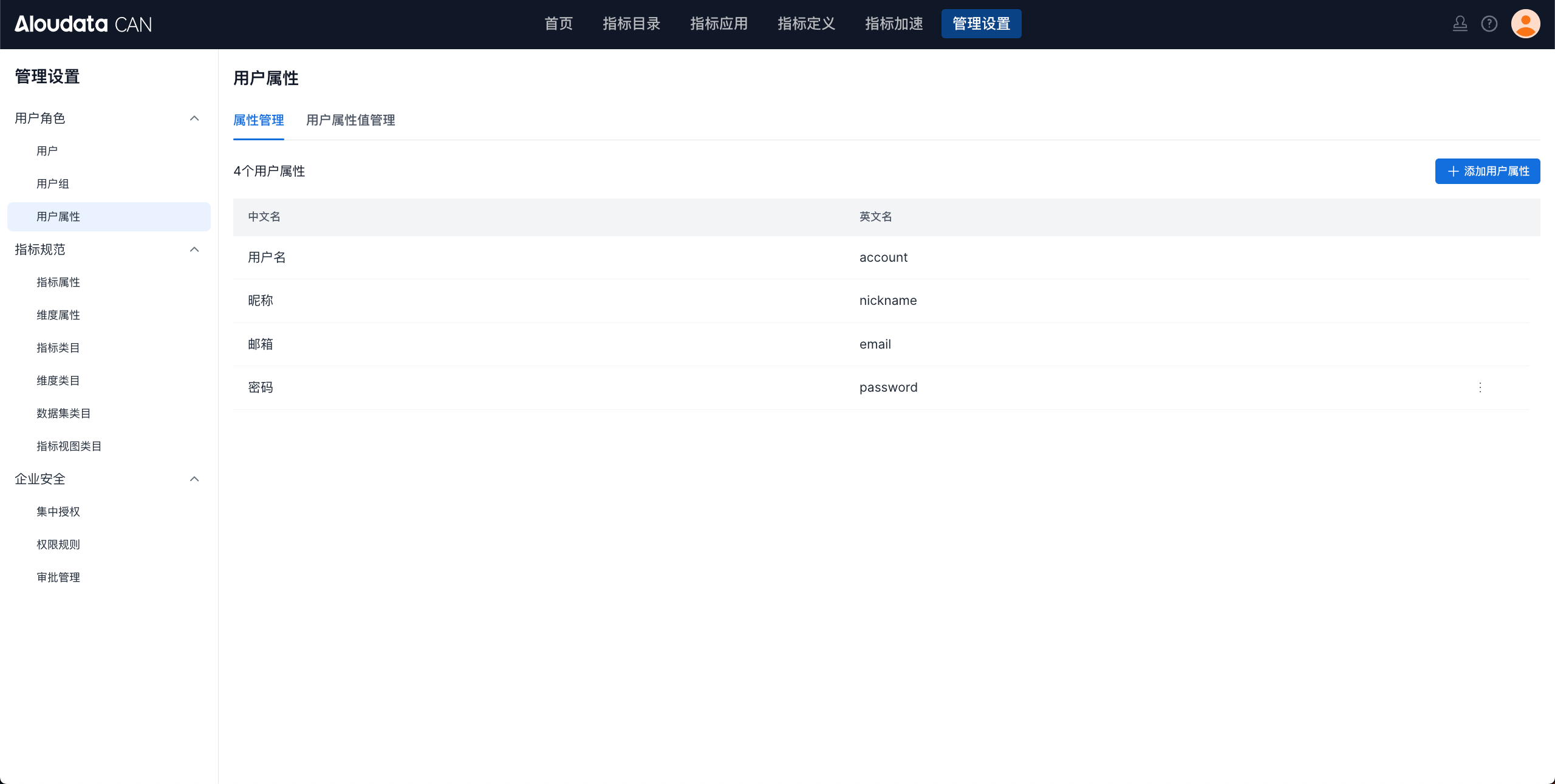 用户属性界面中,点击右上角的添加用户属性,弹出添加用户属性窗口。如下图