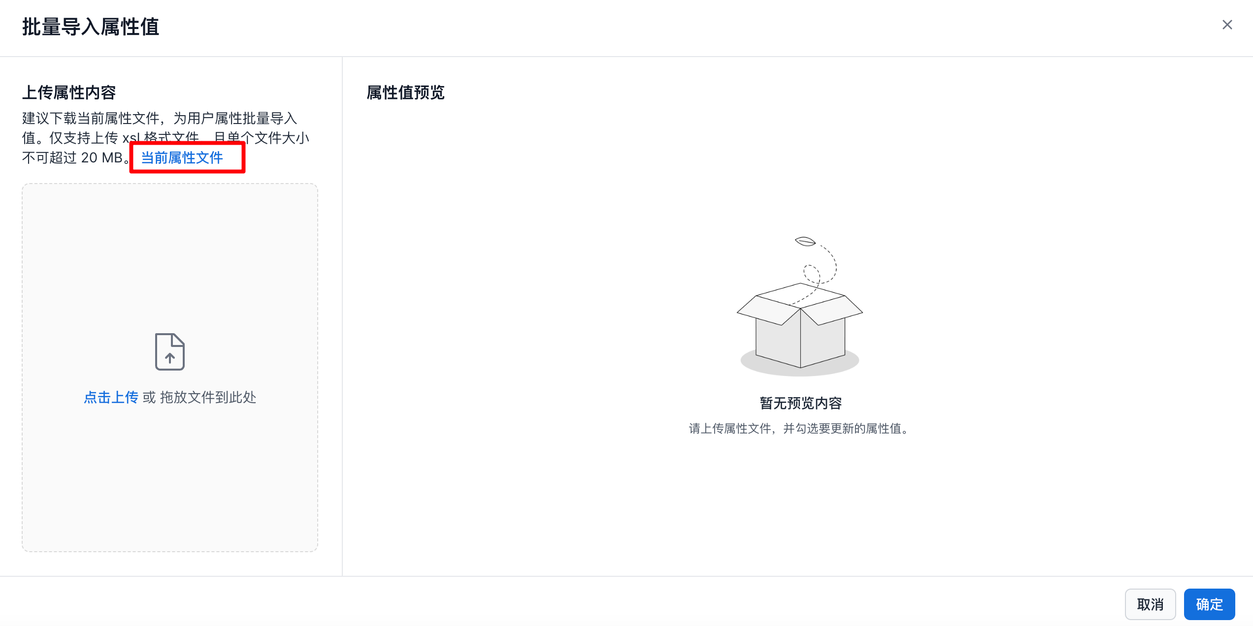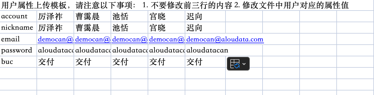 - 下载当前属性文件:下载一个 xls 格式的文件内容,该文件内容包含当前全部的用户属性。如下图: