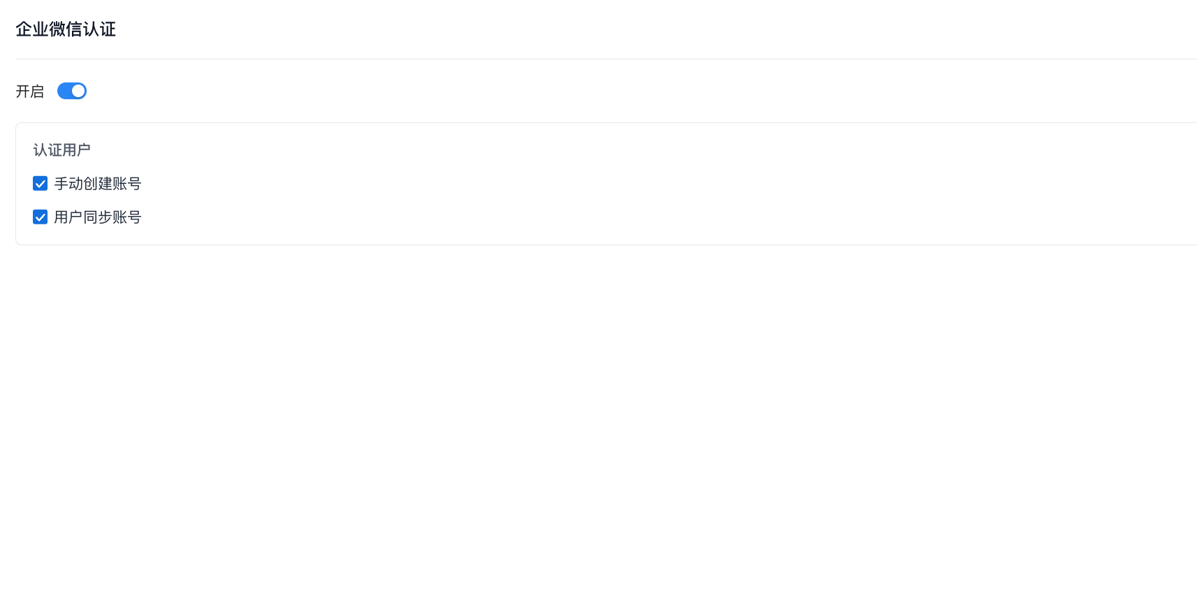 | 企业微信认证 | - 需要手动开启 - 前提:办公软件已完成 企业微信集成 - 手动账号、同步账号可选择是否启用,取消勾选后该账号将不支持通过企业微信认证方式登录 |