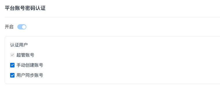| 平台账号密码认证 | - 默认开启,无法关闭 - 超管账号不可取消选中 - 手动添加账号、同步账号可选择是否启用,取消勾选后该账号将不支持账号密码认证登录 |