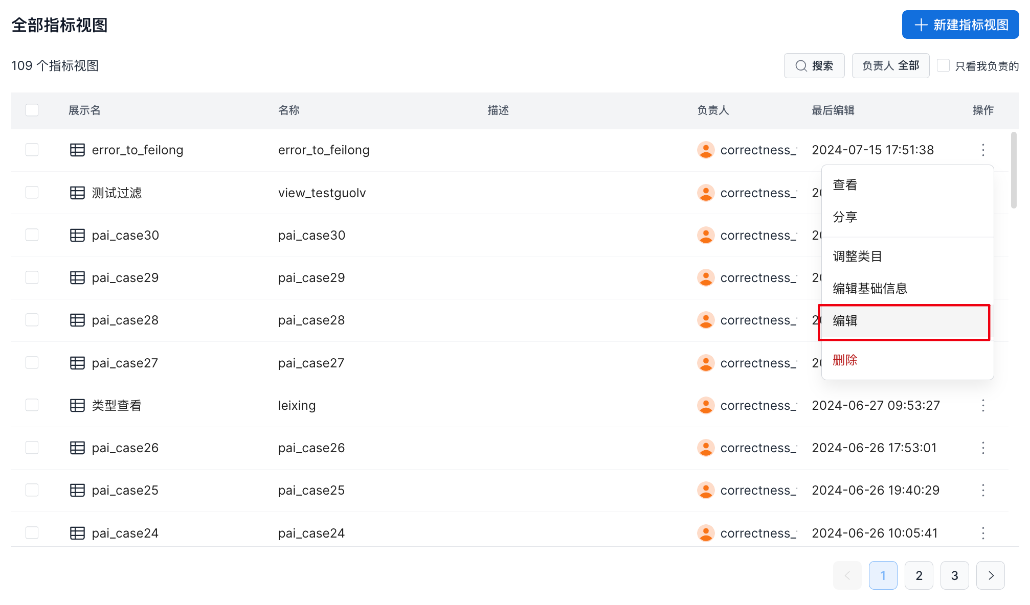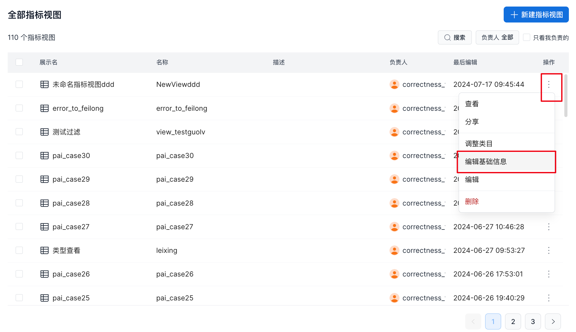 在指标视图列表中,在指标视图右侧点击⋮按钮,选择编辑基础信息。会编辑的弹窗。