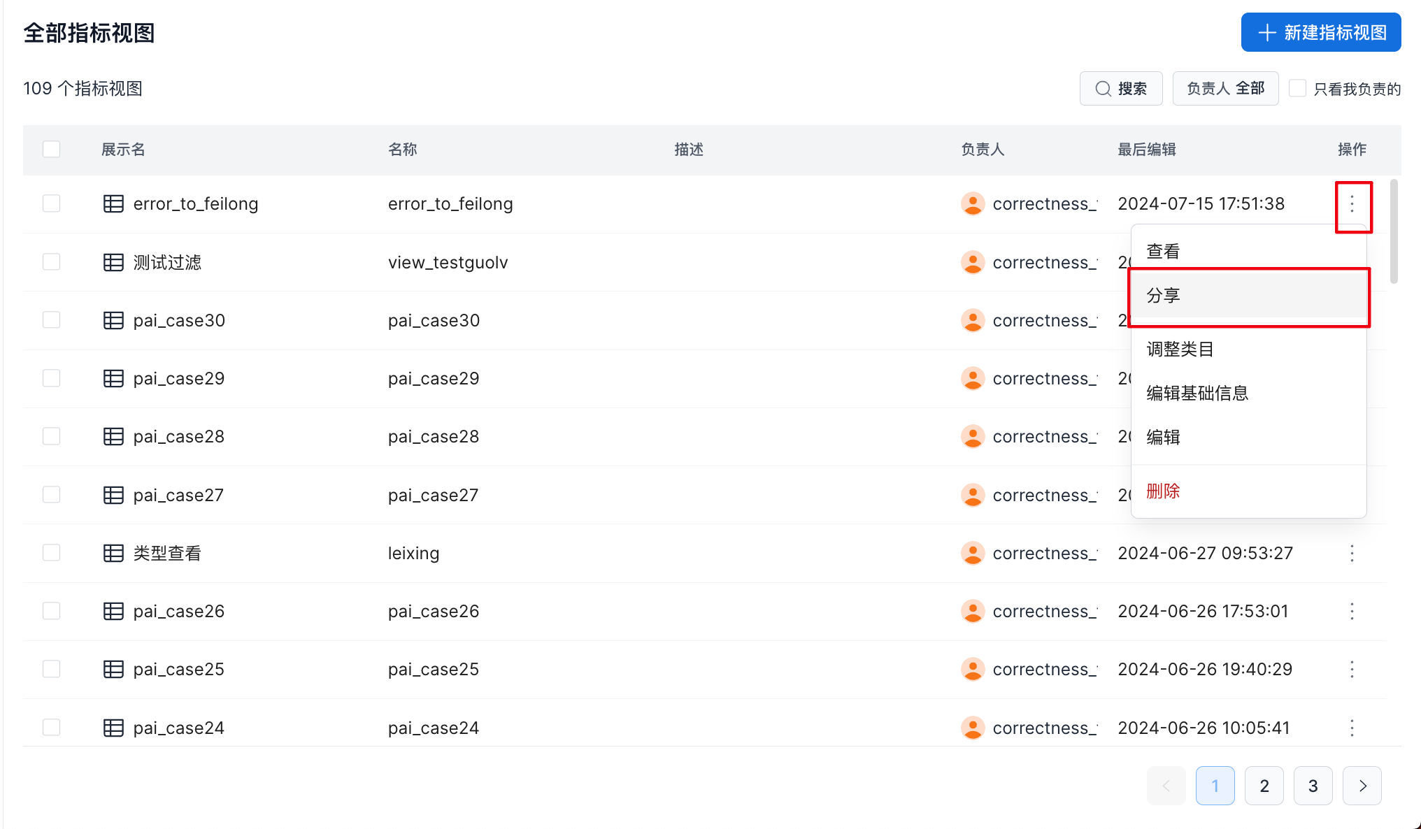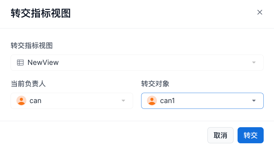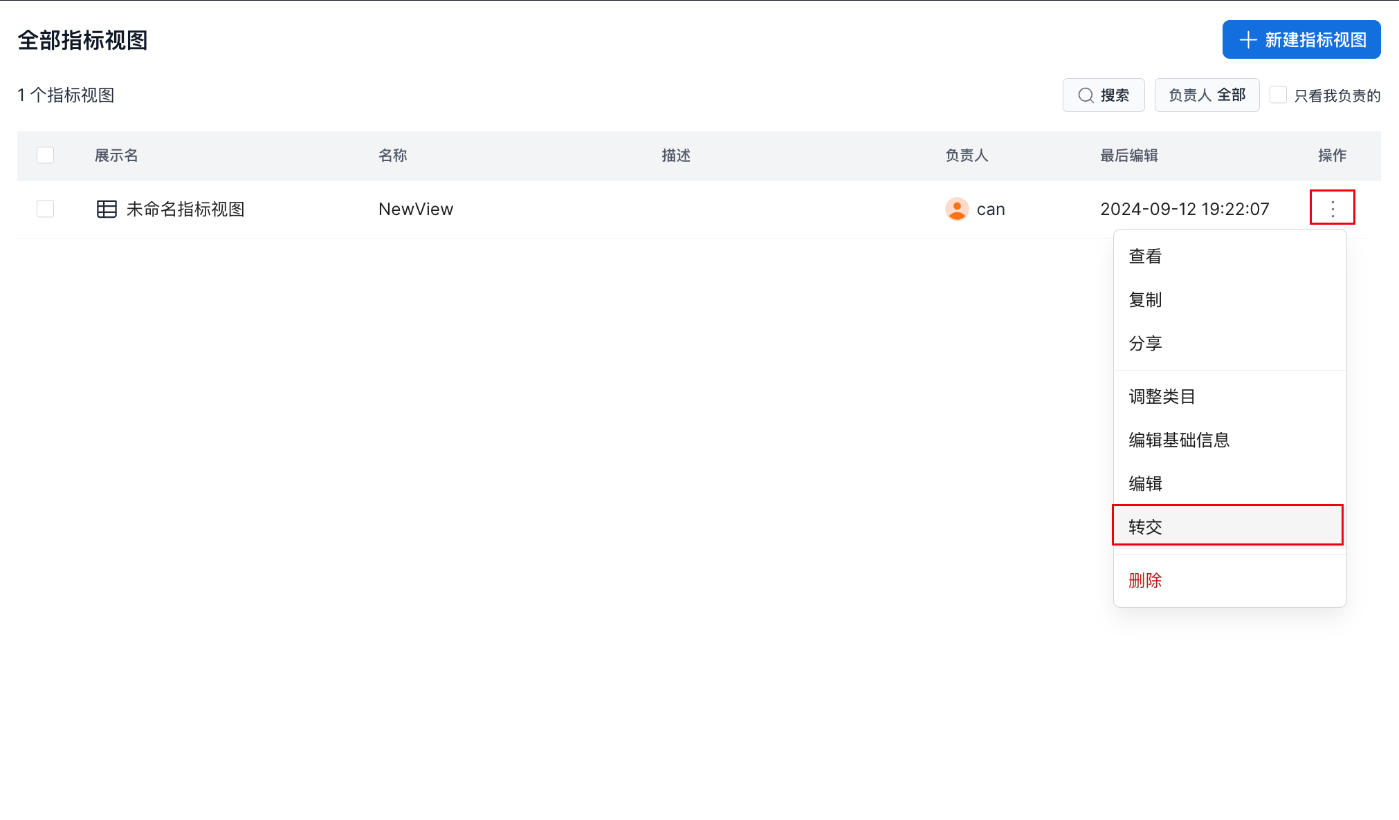 在指标视图列表界面中,点击操作下方的⋮按钮,点击转交。如图所示: