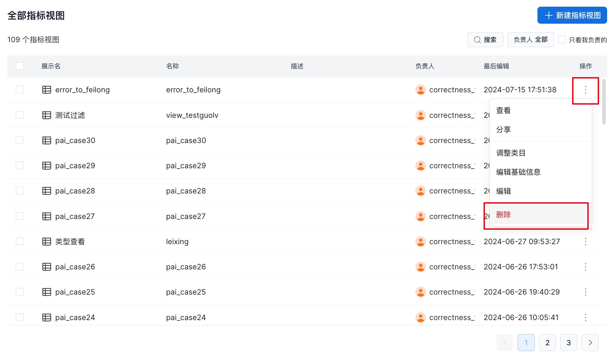 在指标视图列表界面,在指标右侧点击⋮按钮,点击删除,在弹窗中点击确认删除。