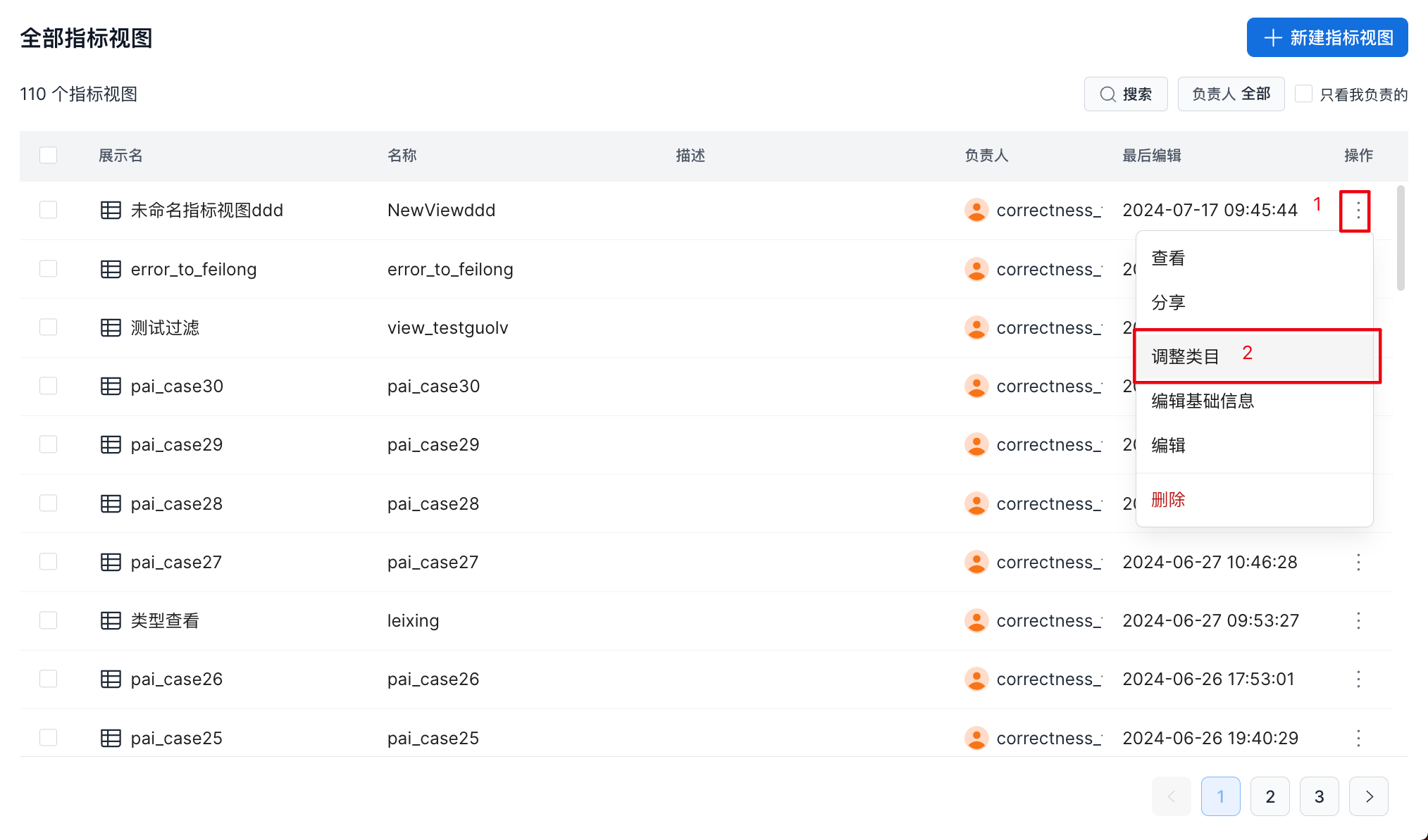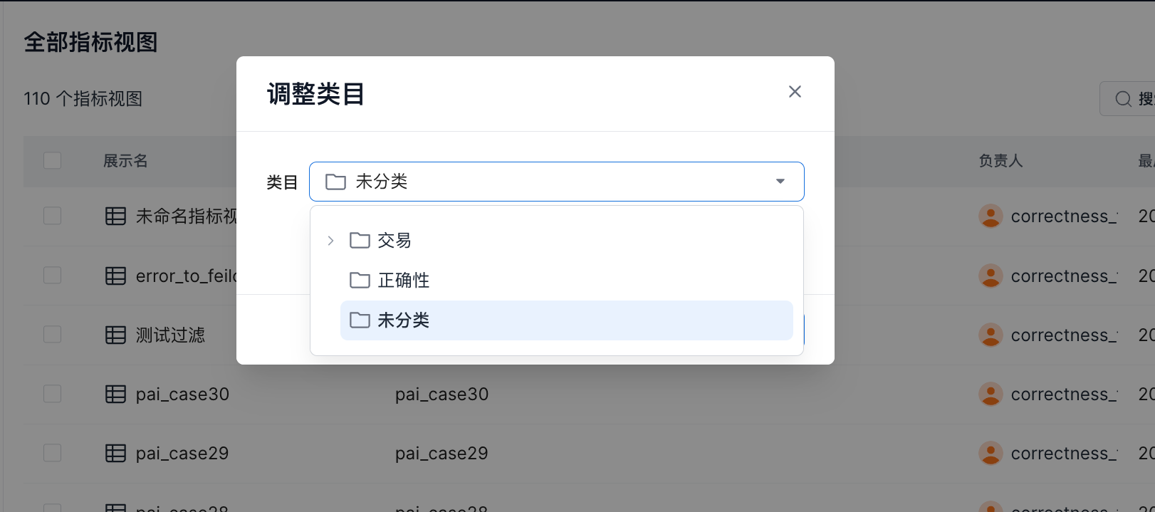 在指标视图列表中,在指标视图右侧点击⋮按钮,选择调整类目。会弹出调整类目的弹窗。