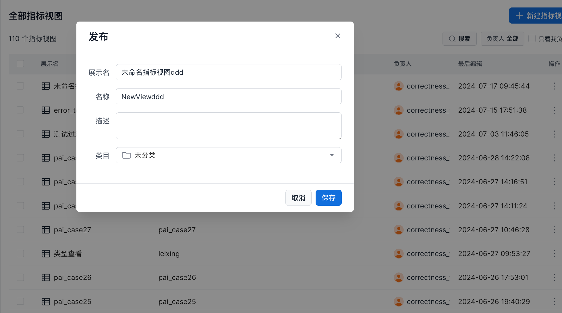 在修改基础信息的弹窗中,支持修改指标视图的展示名、名称、描述和类目的信息