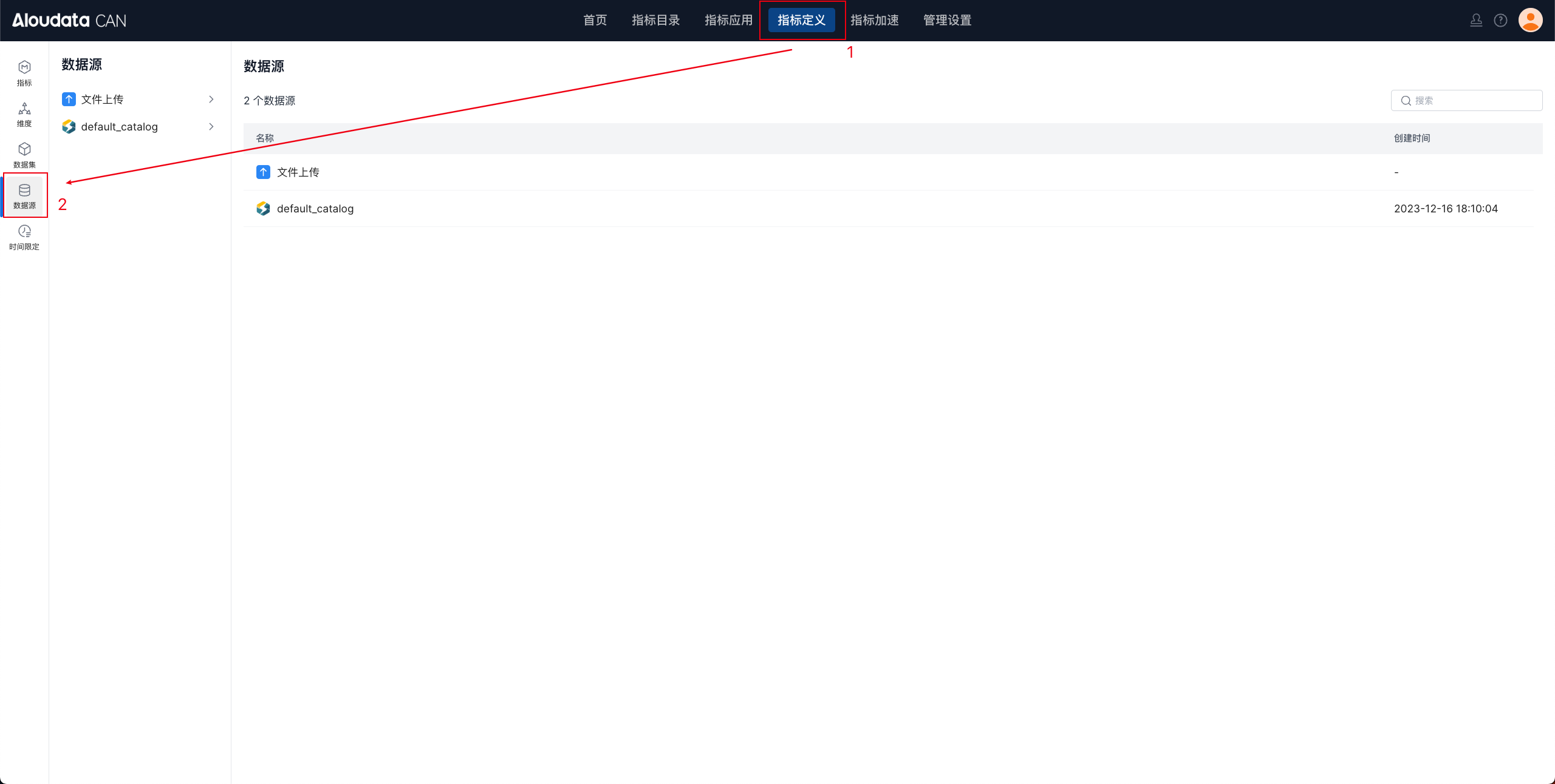 在首页顶部导航栏中选择指标定义->左侧数据源,进入数据源管理页面。如下图:
