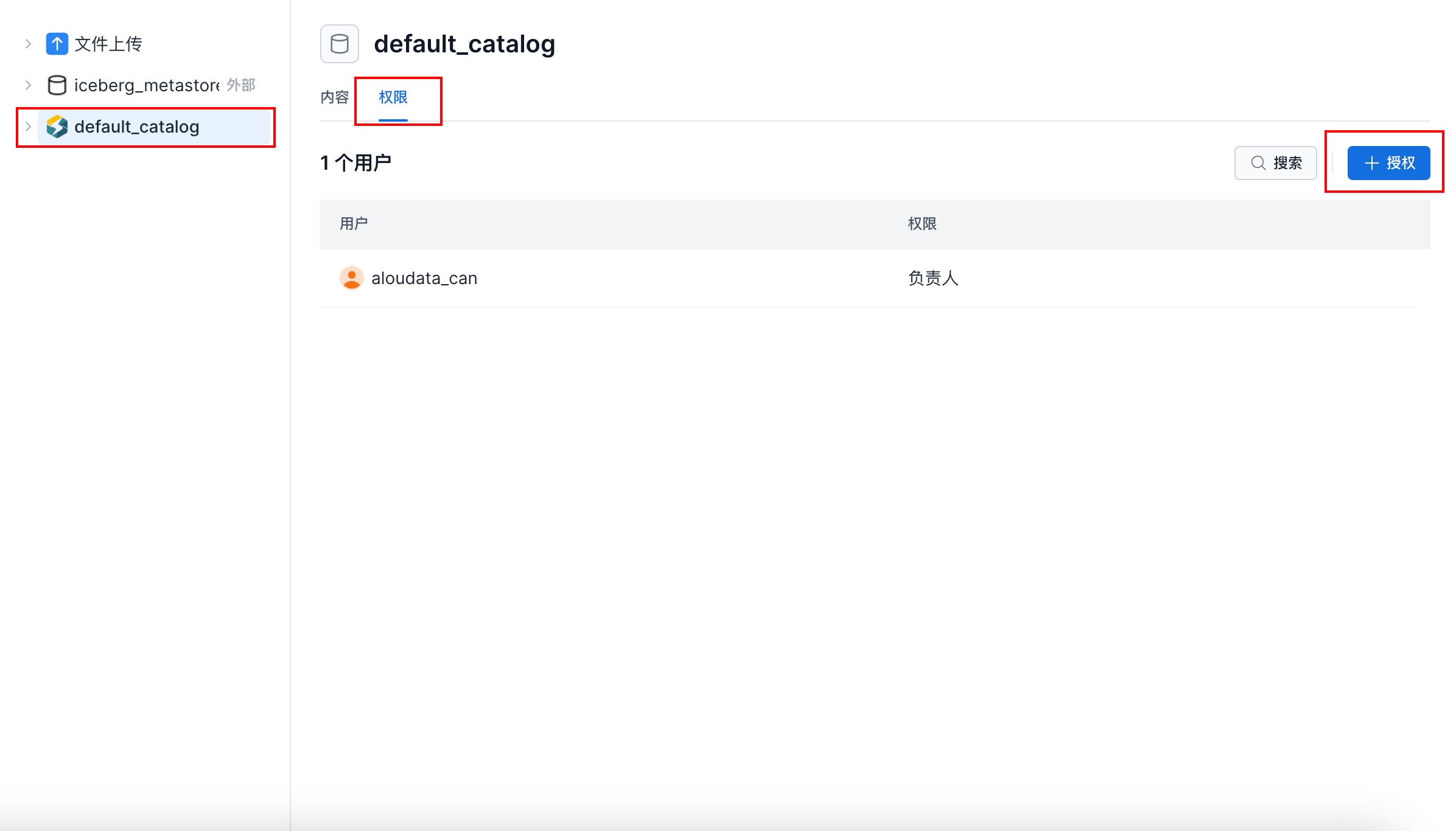 在数据源管理界面中,选择指定数据源,在数据源详情界面中选择权限。如下图: