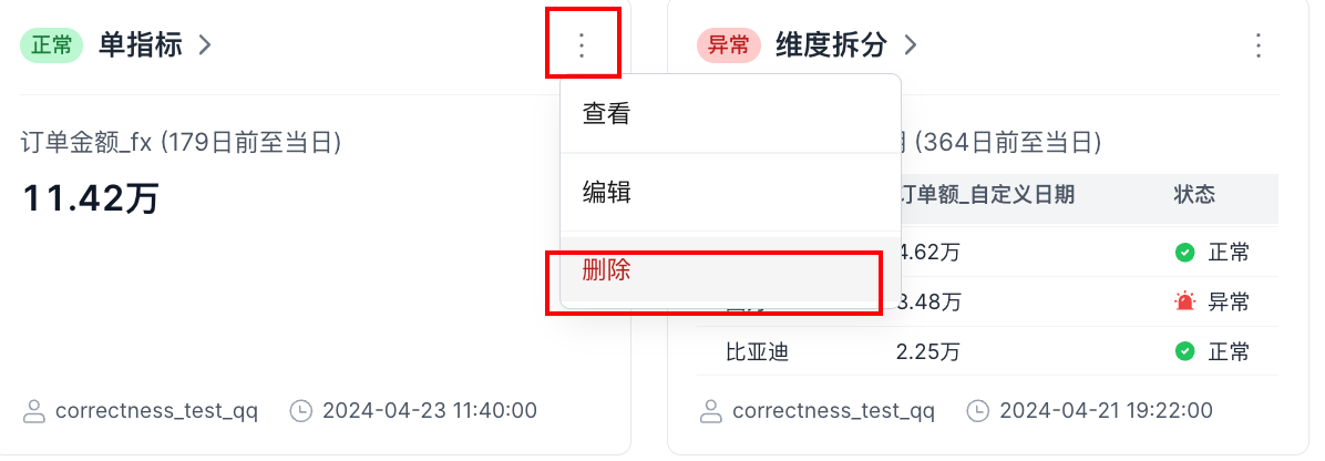 在卡片预览右上角,点击⋮按钮,选择删除。再弹窗中点击确认即可删除指标监控。