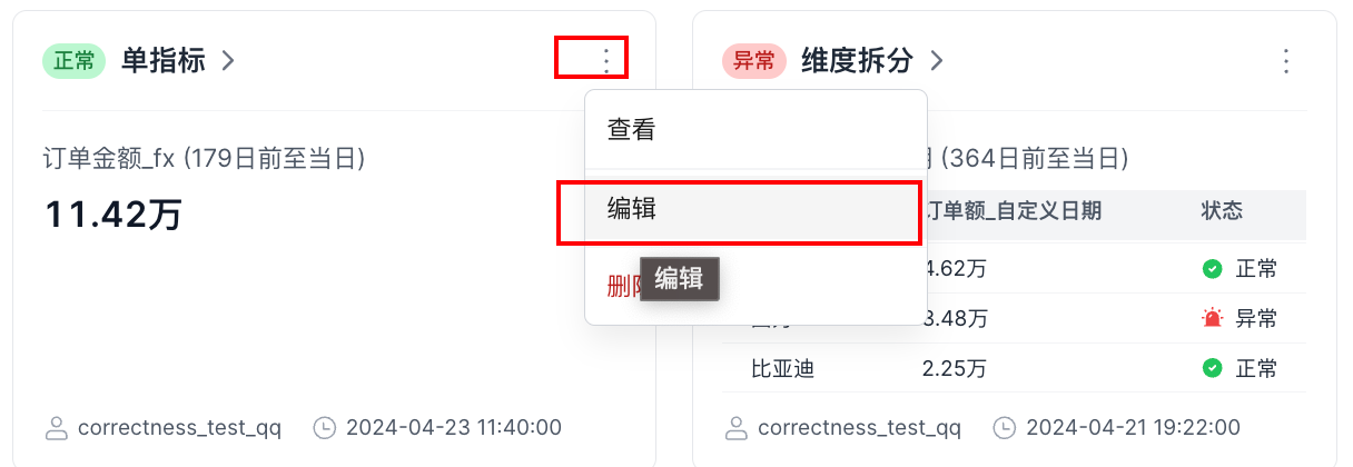 在卡片预览右上角,点击⋮按钮,选择编辑。编辑内容与新建监控->监控指标设置内容一致。参考 2.2监控指标设置和 2.3消息推送设置