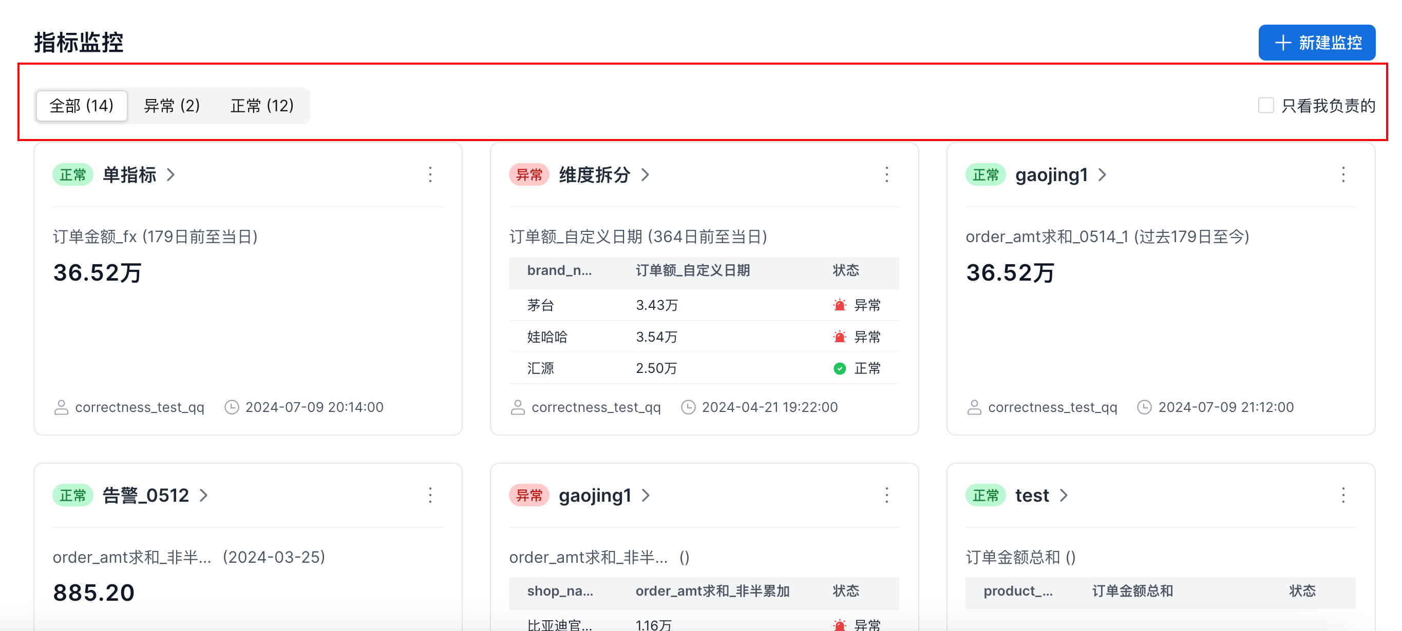 在指标监控界面,您可以按需选择全部、异常、正常的指标。以及勾选只看我负责的指标监控。如下图: