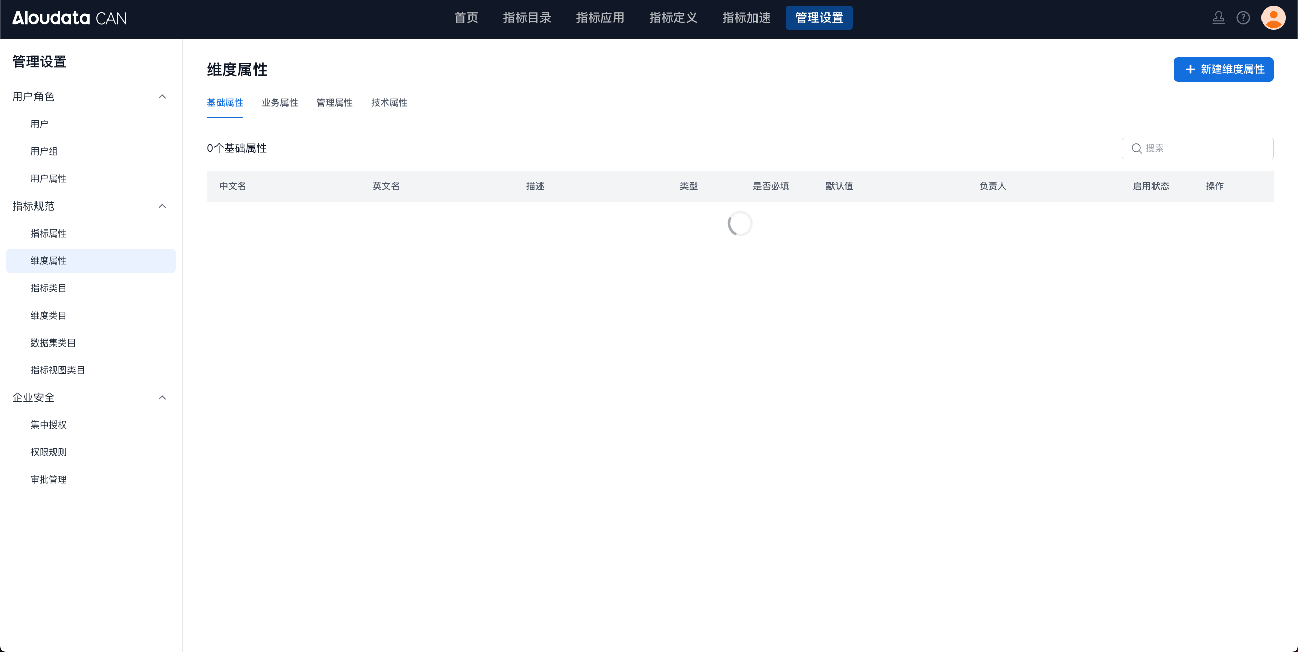 | 属性分类 | 基础属性、业务属性、技术属性、管理属性;从新建指标属性入口进入,带入当前界面的属性分类 |