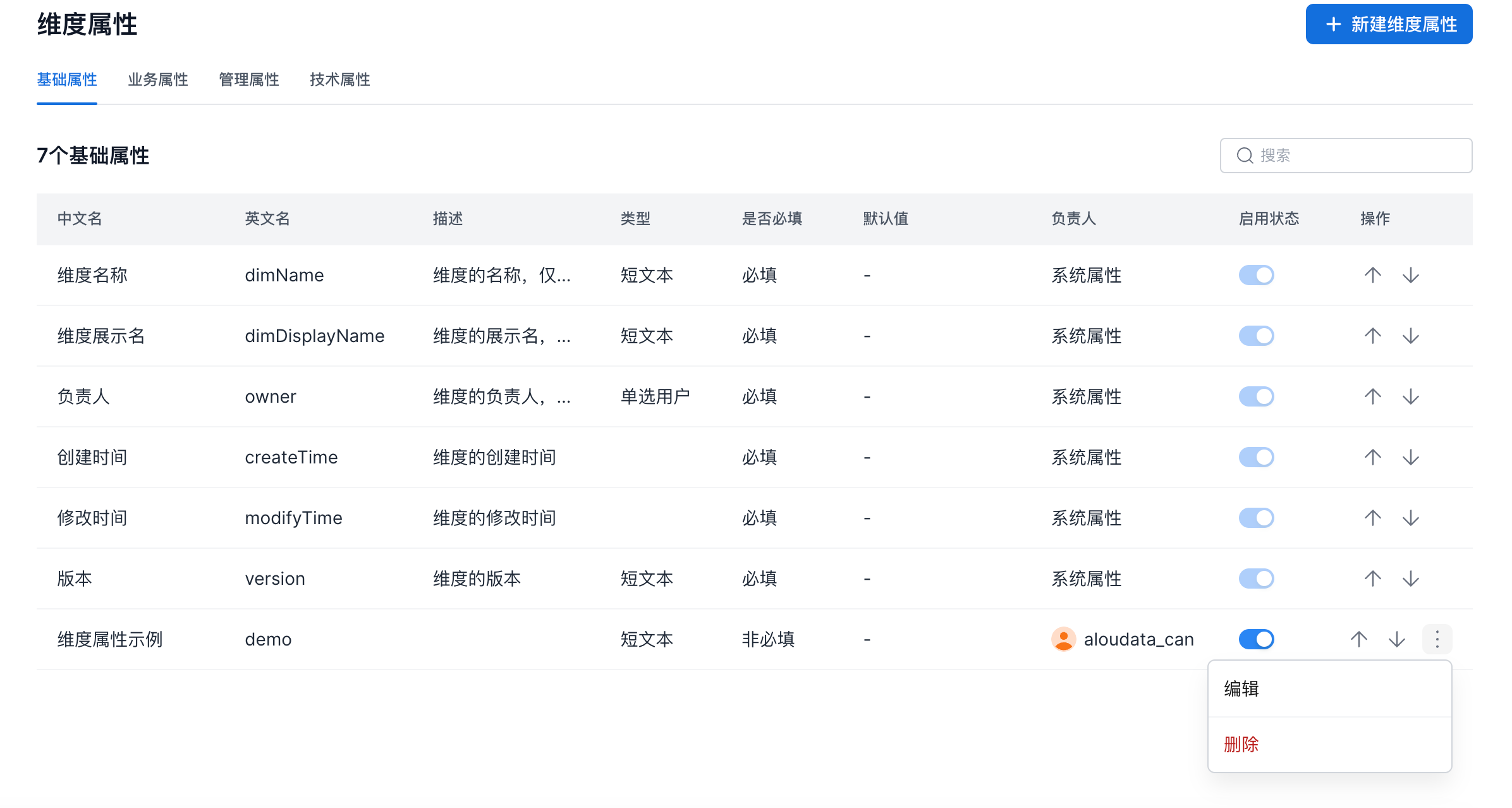 基础属性、业务属性、技术属性、管理属性四个分类,支持在单个分类中调整属性的顺序。