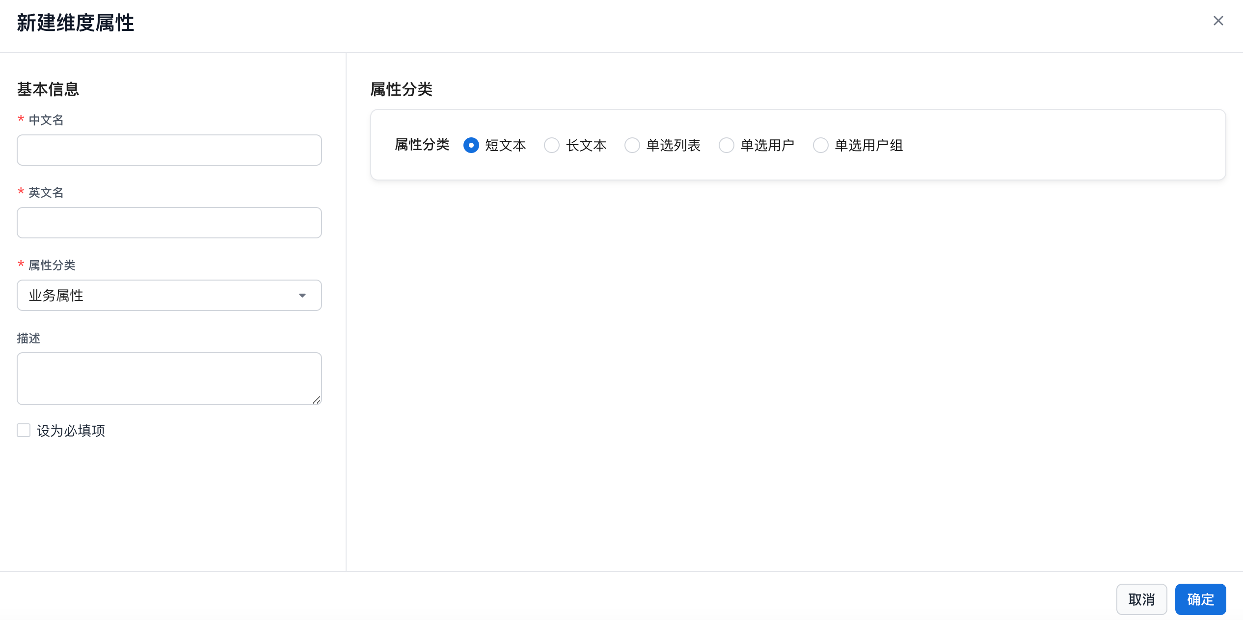 | 维度展示名 | dimDisplayName | 维度的展示名,便于理解 | 文本输入 | 必填 | 无 | 系统属性 | |