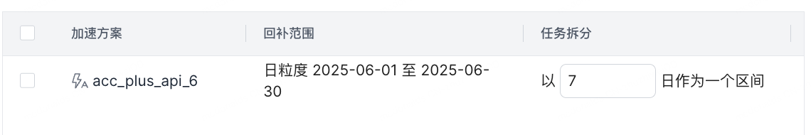 | dateIntervalOfLot | Intger | 否 | 根据指定时间区间进行数据回补。例如:7 ,如下图,表示已 7 日作为一个区间进行数据回补![]() |