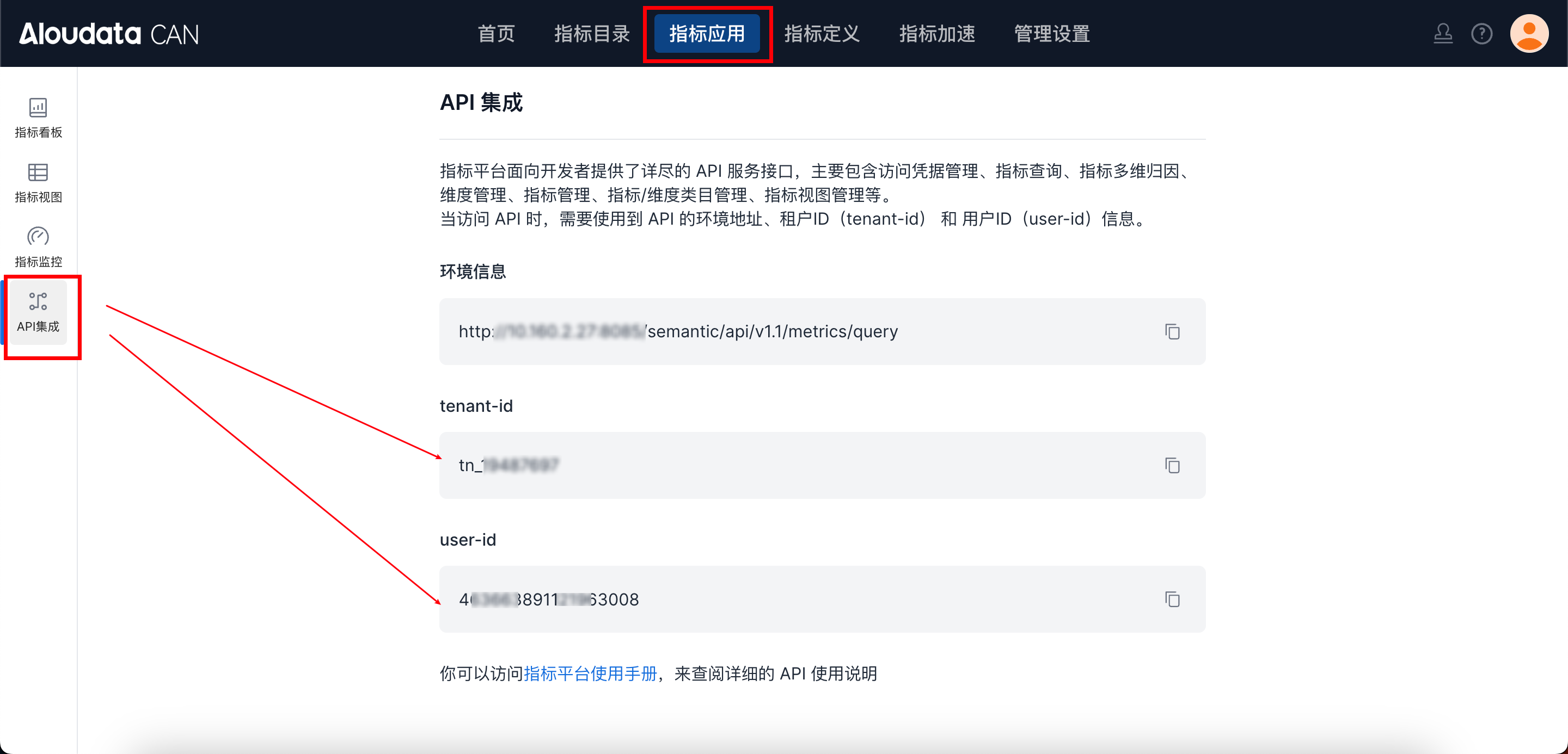 tenant-id 与 auth-value:在 Aloudata CAN 顶部导航栏选择指标应用,左边菜单栏选择 API 集成。在 API 集成界面获取取到tenant-id 与auth-value。